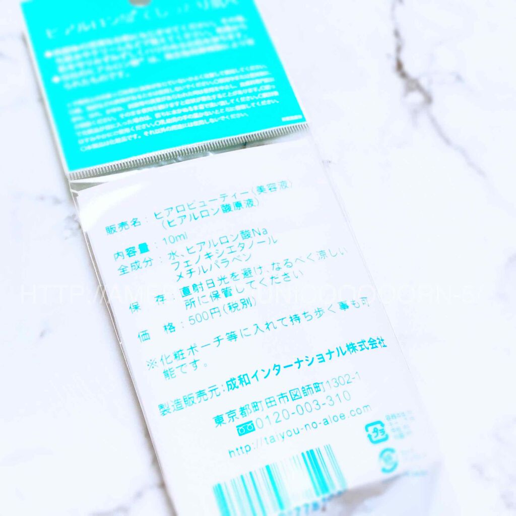 - そのままのヒアルロン酸原液。しっとりとした潤いで、乾燥からお肌を守り、みずみずしくハリのあるお肌に導いてくれます。ヘアケアに使用すると艶のあるサラサラヘアーになります。「太陽のアロエ社 ヒアルロン酸」は国内工場で微生物による発酵で製造された純国産の良質なヒアルロン酸ナトリウムです。小さいボトルなので、化粧ポーチなどに入れて持ち歩くこともできます。