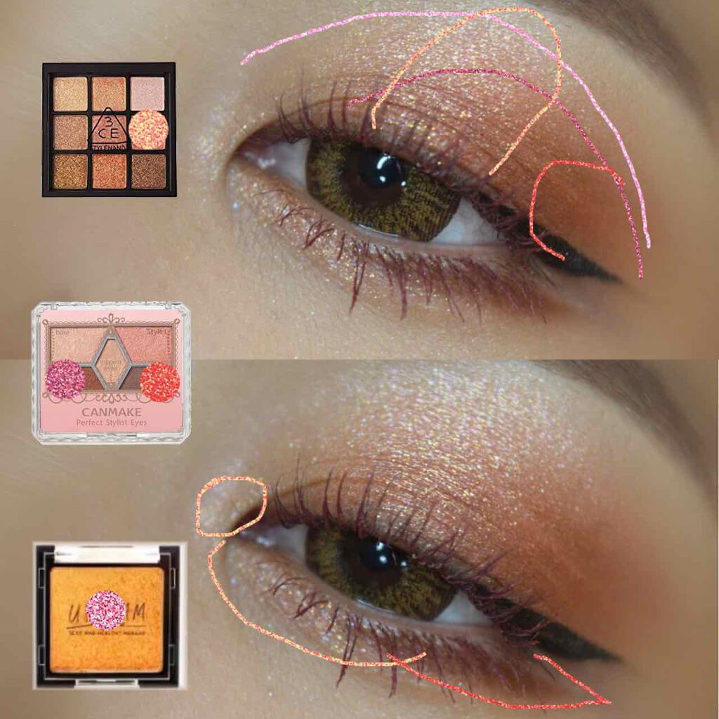 またまたzeesea様の🤲🏻✨..今日はゴールドメインで💗✨..ゴールドだけだと浮くかな?と思って赤っぽいラメを混ぜて塗ったらギャンカワ😭✨我ながらかわいすぎるーー🥺💗..アイラインは太めにして、今流行ってる?foxeyesっぽく🥺..目が盛...
