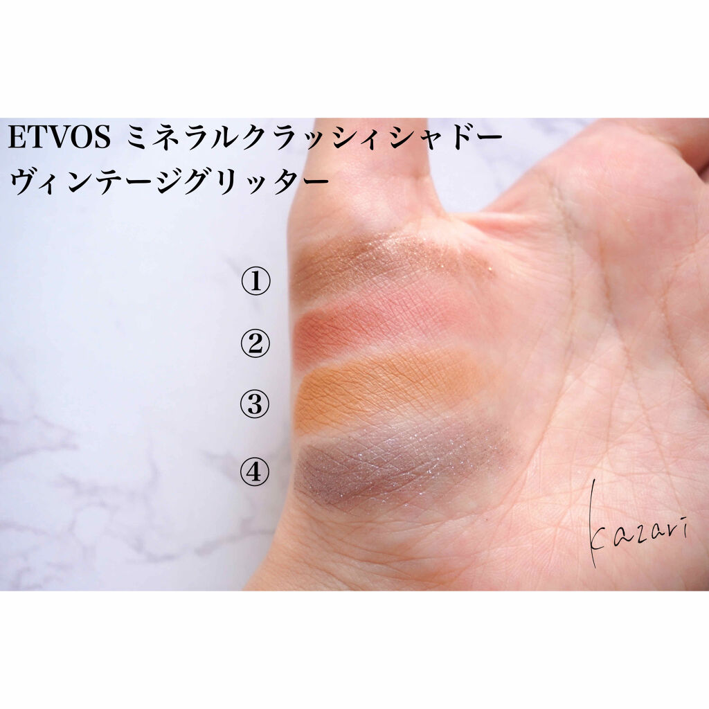 石鹸オフが嬉しいミネラルアイシャドウ🌸エトヴォスミネラルクラッシィシャドーヴィンテージグリッター気になっていたミネラルアイシャドウ、色味が可愛くて購入しちゃいました!ラメ入りだけどちゃんと落ちるのかドキドキでしたが、スウォッチした部分はハンド...