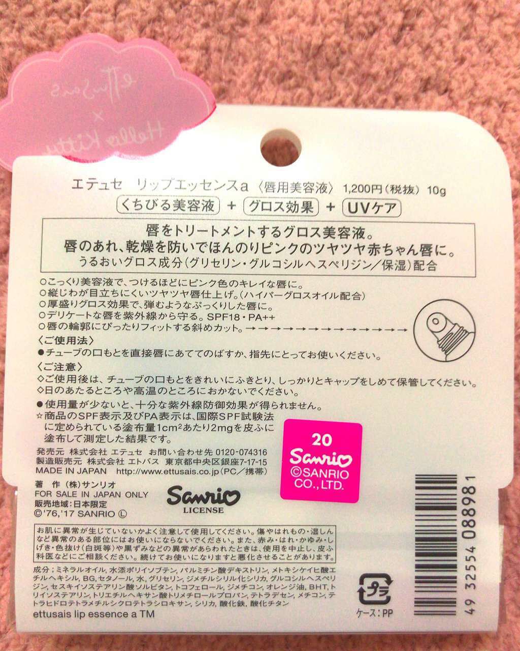 - <10g(リップエッセンス)> ミネラルオイル、水添ポリイソブテン、パルミチン酸デキストリン、メトキシケイヒ酸エチルヘキシル、BG、セタノール、グリセリン、水、ジメチルシリル化シリカ、グルコシルヘスペリジン、アセチルヒアルロン酸Na、水溶性コラーゲン、セスキイソステアリン酸ソルビタン、ケイ酸(Li/Mg/Na)、トコフェロール、シメチコン、オレンジ油、BHT、トリイソステアリン、トリエチルヘキサン酸トリメチロールプロパン、メチコン、テトラデセン、水酸化Al、テトラヒドロテトラメチルシクロテトラシロキサン、リンゴ酸ジイソステアリル、ジイソステアリン酸グリセリル、シリカ、フェノキシエタノール、酸化鉄、酸化チタン、硫酸Ba、赤202