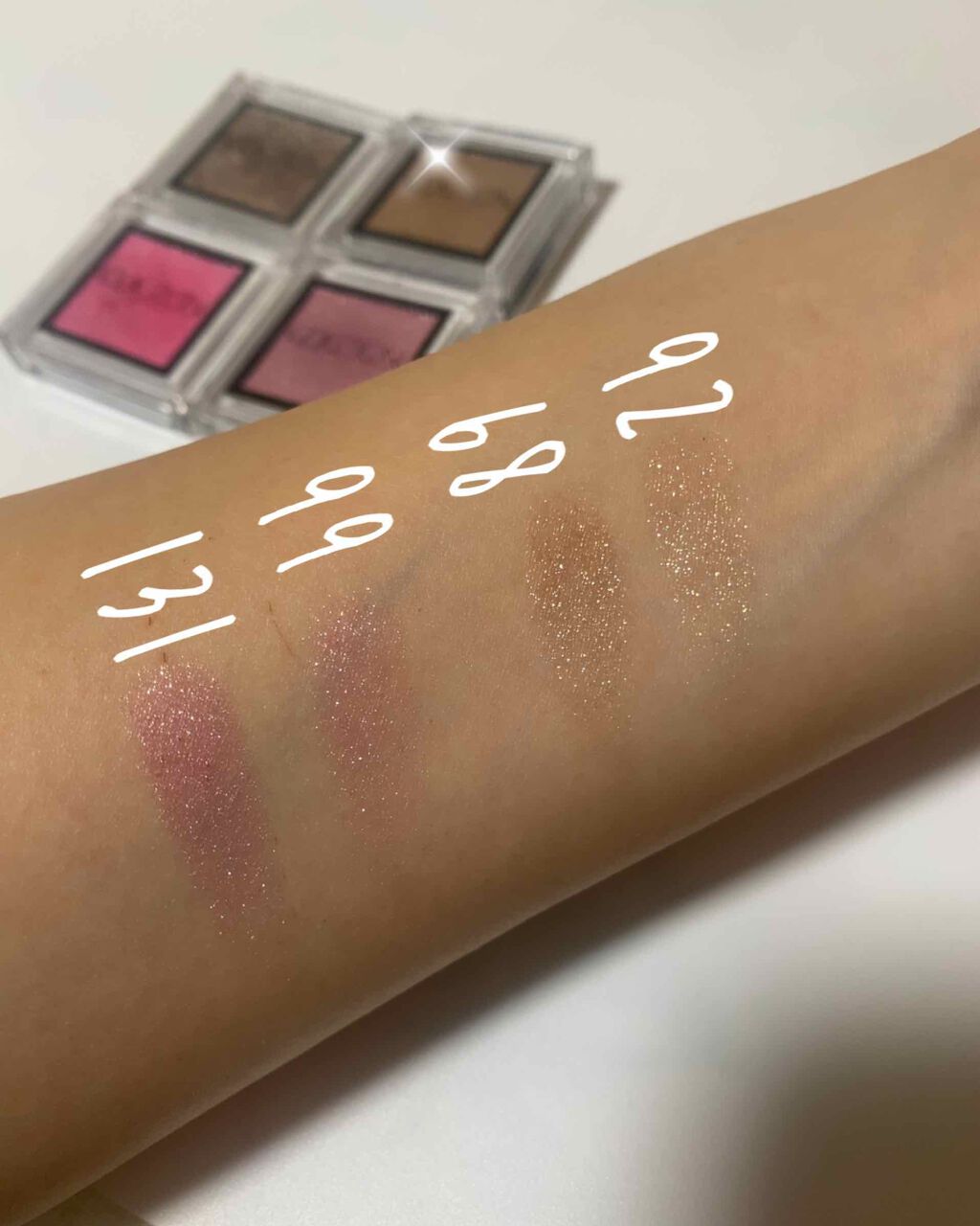 しっとりとしていて、密着。なのにぼかしやすい。 艶っとしてるけど艶々すぎず、瞼が綺麗に見えるような仕上がり🙌 021P Coral Pink Sand 淡いコーラルピンク。春夏に使いたくなるようなふんわりカラー!ベースに入れるだけで目元が明るくなります😊 024P Getaway ちょっと秋っぽい雰囲気の落ち着いたオレンジ🍊入れすぎると腫れぼったくなってしまうのでつけすぎ注意🥺 個人的には二重幅目尻にしっかりめに塗る使い方が好きですが、意外と薄くふんわりと使用することも可能なので、使い勝手がよい。 015SPGleamy Pond キラキラかわいいラメ!春夏は勿論、冬の夜など雪の結晶のようにキラキラさせたい! 目元を華やかにさせたい時に🥳 018SPBrick スパークルの割にはあまりキラッキラではなく、015SPに比べると落ち着いてる。 意外としっかりめに発色するのでつけすぎ注意😗