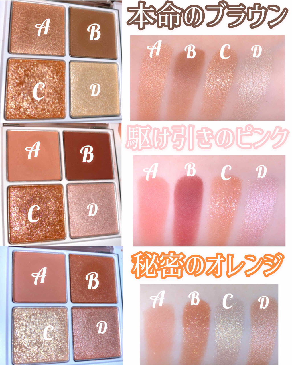 - 魔法の4色で印象的な目元に。 きらめきシャドウ×ハイライター あらゆるアイシャドウパレットを試してきた吉田朱里がたどり着いたのは“カラー3色+ハイライト”の4色パレット。 質感の異なるきらめきパウダーと、こだわりの配色で視線をひきつける印象的な目元へ。 立体感をつくるツヤ増しハイライター入り。 細部まで計算されたベストパレットで、一気にアイドル級の目力を演出します。 ※チップ・鏡はついておりません。 ※2023/3/31 リニューアル