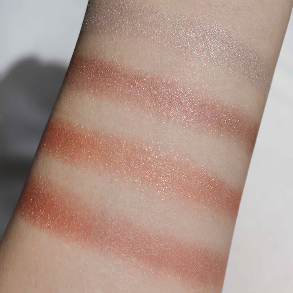 肌馴染みの良いベージュを基調とした配色です。 ラメ・パール・マットの異なる質感の組み合わせ ナチュラルに彩り、立体感のある目元に仕上がります。 保湿成分であるスクワラン・ホホバ種子油を配合 しっとりした柔らかいテクスチャーで高密着。 スウォッチを見ていただければ分かるように、とにかく肌馴染み抜群! 目元に溶け込むような仕上がりです。 ふんわりした質感で目元のアラが見えにくくなりました。 01と02はオレンジ感とピンク感の多少の違いがある程度です。 個人的には左上のラメの質感やカラーがとっても好きです
