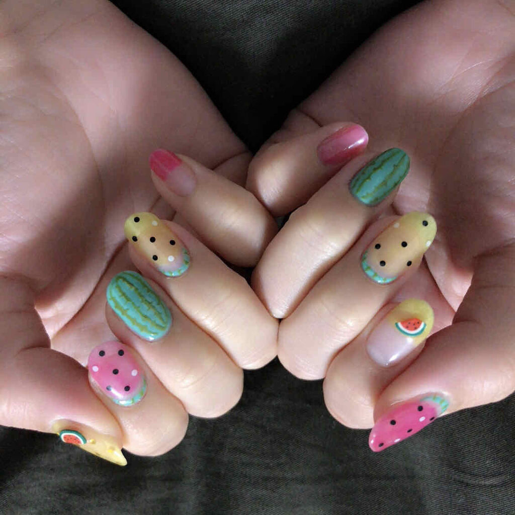 ポイントは野暮ったくなりがちな緑の部分をレインボーラメのグリーンにすると、可愛いさマシマシ! もうひとつは、シアーホワイトを塗ることでリアルなスイカの白いところの再現&クリア系レッドや、ハーフクリア系でも透け防止で発色を良くしてくれる! 最後のポイントは、タネを一粒ゴールドに!黒で3個作って、一粒だけ黒ベースの上にハードラインジェルでミラーパウダーコスコスで作る方が存在感でます! 囲みの粘土ジェルもレインボーラメが拡大されて綺麗に見えるんだよ!細めの方が指が太って見えない!
