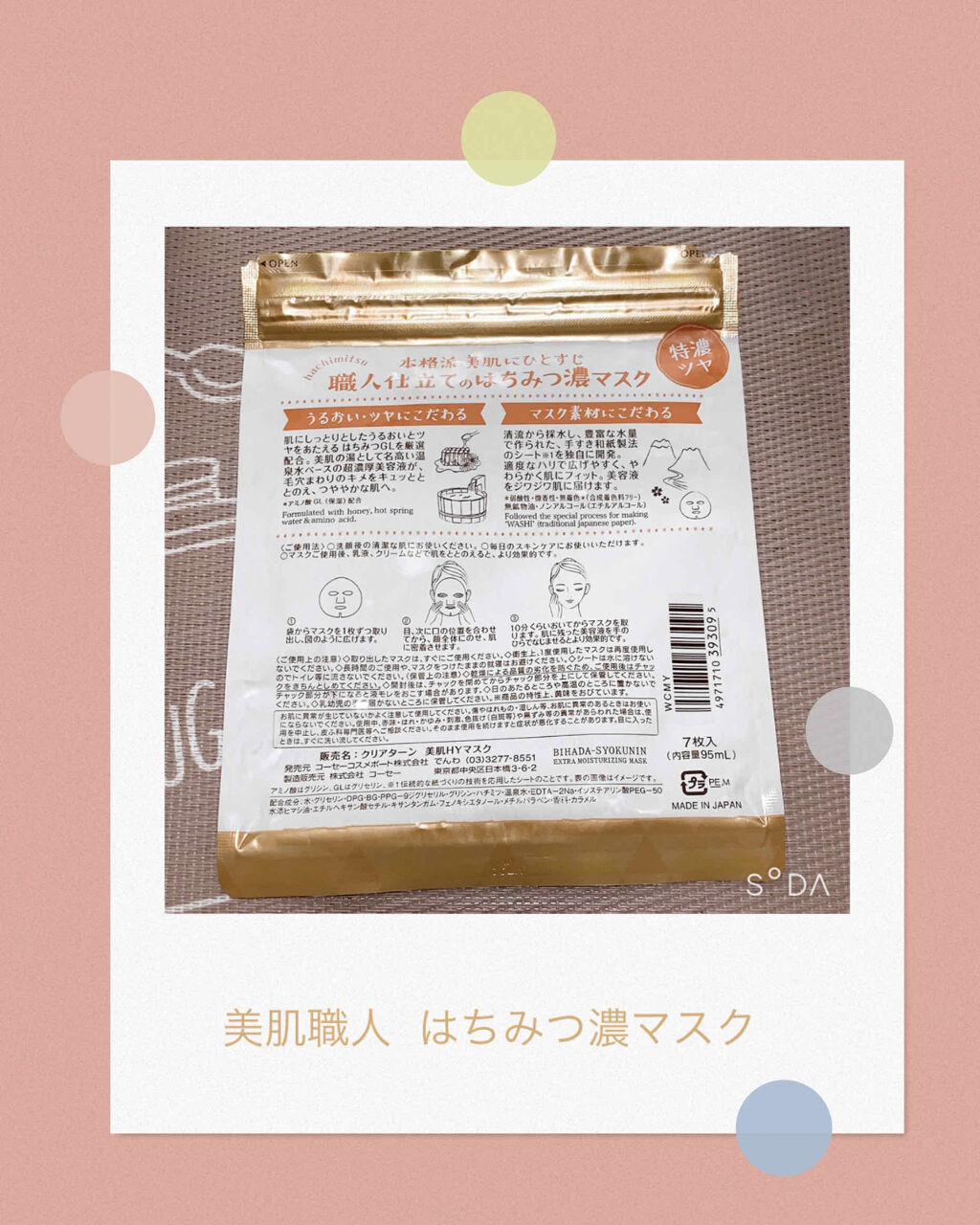 マスクの色がはちみつ色!匂いははちみつレモン!🍯🍋って感じだった!笑 クリアターンのごめんね素肌シリーズは液がひたひたって感じだったけど、こっちの美肌職人シリーズはそこまでひたひたって感じではなかった! でもちゃんと保湿されるからちょうど良い液量が入ってるって感じ!