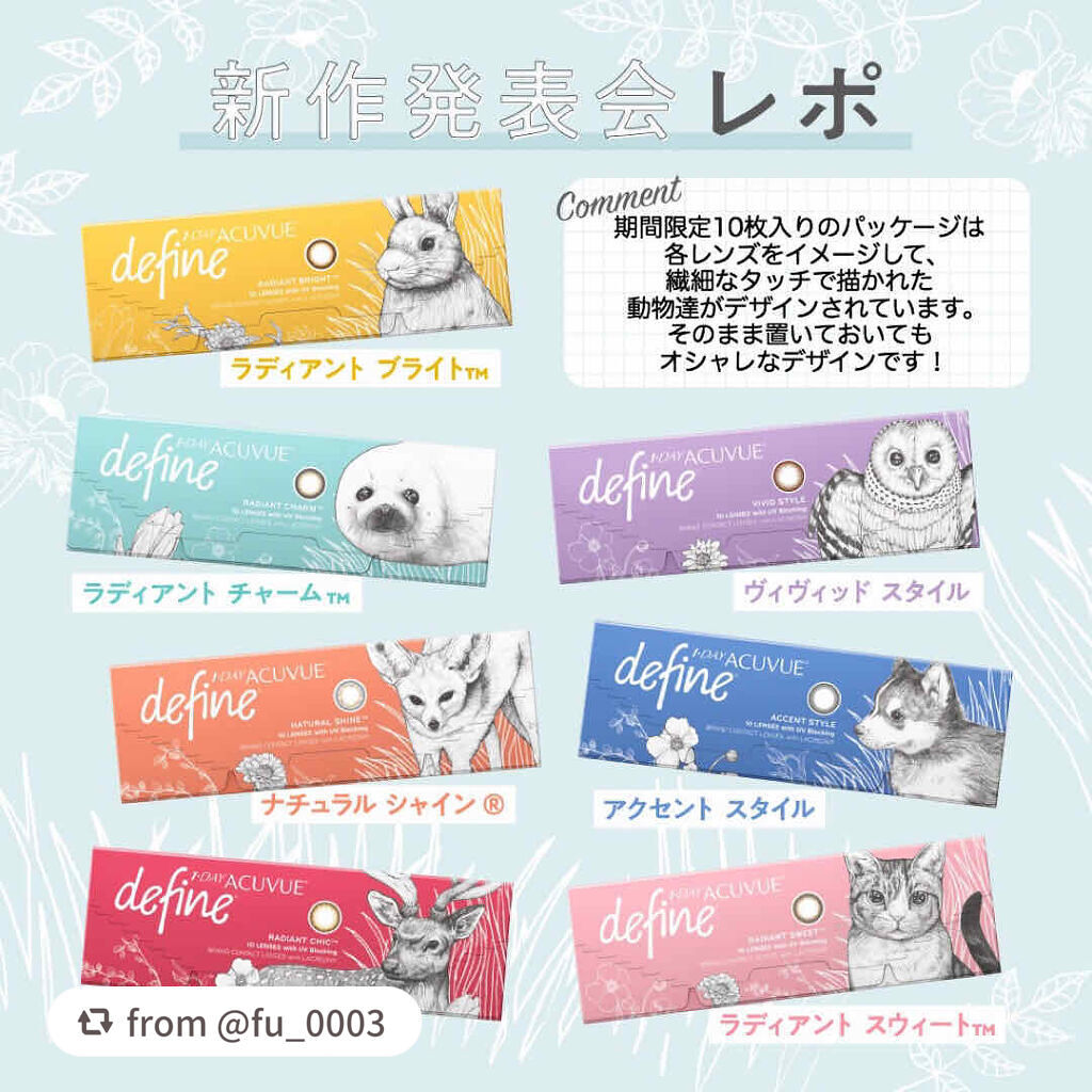 - ディファイン® のアート&サイエンス 瞳を知り尽くしたジョンソン・エンド・ジョンソンの アキュビュー® ディファイン® だからこそできる、こだわりのデザインと機能。 -Art- ①ディファイン独自のビューティークラフト 瞳本来の美しさをひきだす手描きライン*1 人の瞳が本来持つ、虹彩の自然なゆらぎやわずかな隙間まで。瞳を知り尽くした専属デザイナーが、その手で繊細なラインを1本1本描き込んだ、本来の瞳を活かしたデザイン。だから、こんなに自然、近寄ってもきれい。 ②1人1人の瞳の色となじむ透明感あるシアーカラー*2 透け感のある色素を使用。本来の瞳の色を隠さず、活かしてなじむ。 ③瞳に立体感と輝きを与える3層レイヤー*2 奥行き感を与える、ハイライトを入れる、なじませる。 3つのレイヤーで立体感と輝きをプラス -Science- ①快適なつけ心地が1日中持続する、瞳の健康と快適性を考えた、「デュアルコンフォートレンズ」 保湿成分配合で、朝から夜まで快適つづく 独自のラクリオン® ・テクノロジー*3により、レンズ内に閉じ込めた保湿成分が水分をキープ。うるおって、快適なつけ心地が1日中続きます。*4 ②色素が直接瞳に触れない レンズ素材に色素を内包するBeauty Wrapped in Comfort™ Technologyを採用。 色素が表出していない、薄く、しなやかなレンズを実現。 *1レンズ模様のデザイン時 *2一部デザインを除く *3弊社独自のテクノロジー名。レンズ素材であるetafilcon Aに、涙液中の成分に似た保湿成分を取り込みました。その保湿成分は持続してレンズ内に留まります。 *4装用感には個人差があります。