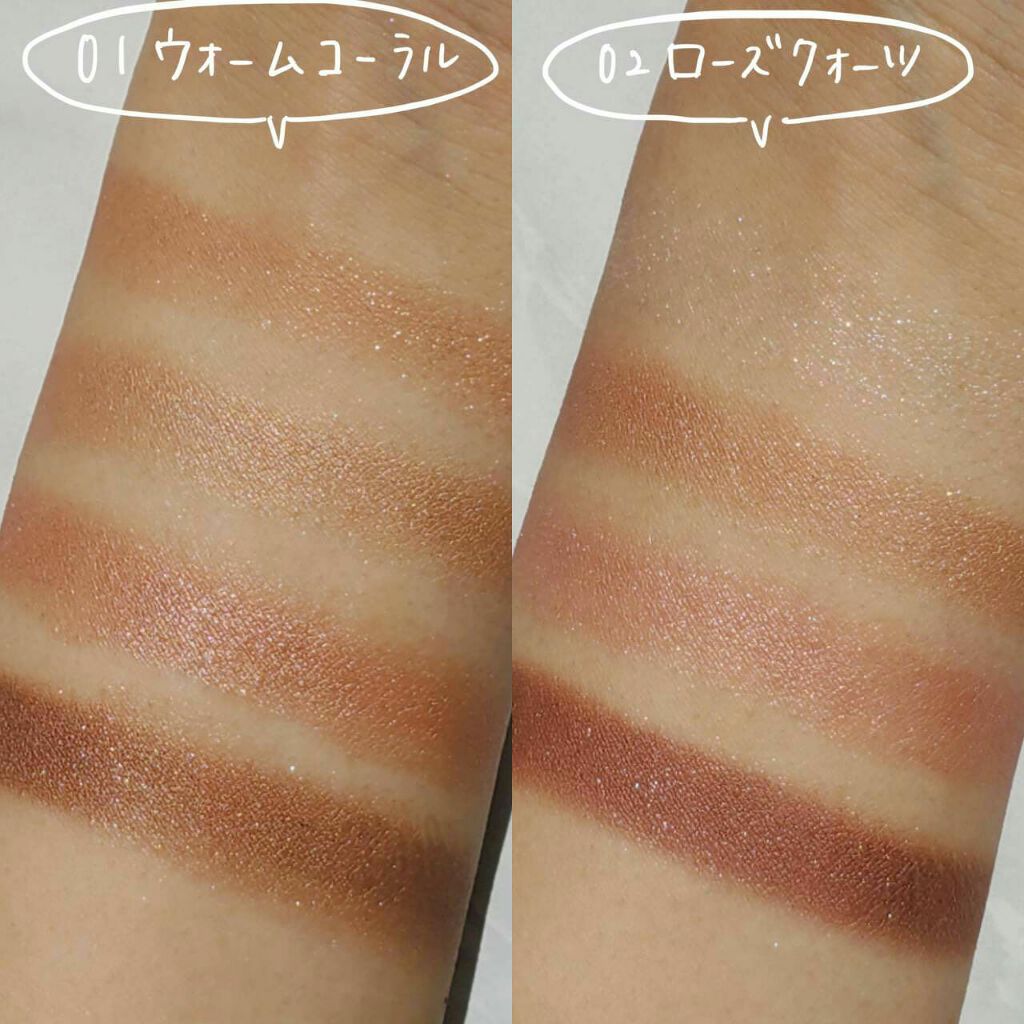 - <01 ウォームコーラル> リンゴ酸ジイソステアリル、トリイソステアリン酸ポリグリセリル-2、トリエチルヘキサノイン、メタクリル酸メチルクロスポリマー、窒化ホウ素、ミリスチン酸亜鉛、シリカ、ヘキサ(ヒドロキシステアリン酸/ステアリン酸/ロジン酸)ジペンタエリスリチル、ペンチレングリコール、ビスジグリセリルポリアシルアジペート-2、フェノキシエタノール、メチルパラベン、トコフェロール、スクワラン、オリーブ果実油、ホホバ種子油、マカデミア種子油、カニナバラ果実油、タルク、マイカ、合成フルオロフロゴパイト、酸化チタン、酸化鉄、ホウケイ酸(Ca/チタン)、酸化スズ、赤202、水酸化Al <02 ローズクォーツ> リンゴ酸ジイソステアリル、トリイソステアリン酸ポリグリセリル-2、トリエチルヘキサノイン、メタクリル酸メチルクロスポリマー、窒化ホウ素、ミリスチン酸亜鉛、シリカ、ヘキサ(ヒドロキシステアリン酸/ステアリン酸/ロジン酸)ジペンタエリスリチル、ペンチレングリコール、ビスジグリセリルポリアシルアジペート-2、フェノキシエタノール、メチルパラベン、トコフェロール、スクワラン、オリーブ果実油、ホホバ種子油、マカデミア種子油、カニナバラ果実油、タルク、合成フルオロフロゴパイト、マイカ、酸化チタン、酸化鉄、ホウケイ酸(Ca/チタン)、グンジョウ、赤202、酸化スズ、赤226、黄4、水酸化Al、マンガンバイオレット <03 ブロンズレッド> リンゴ酸ジイソステアリル、トリイソステアリン酸ポリグリセリル-2、トリエチルヘキサノイン、メタクリル酸メチルクロスポリマー、窒化ホウ素、ミリスチン酸亜鉛、シリカ、ヘキサ(ヒドロキシステアリン酸/ステアリン酸/ロジン酸)ジペンタエリスリチル、ペンチレングリコール、ビスジグリセリルポリアシルアジペート-2、フェノキシエタノール、メチルパラベン、トコフェロール、スクワラン、オリーブ果実油、ホホバ種子油、マカデミア種子油、カニナバラ果実油、タルク、マイカ、合成フルオロフロゴパイト、酸化鉄、酸化チタン、ホウケイ酸(Ca/チタン)、グンジョウ、赤202、水酸化Al、酸化スズ <04 キャメルブラウン> リンゴ酸ジイソステアリル、トリイソステアリン酸ポリグリセリル-2、トリエチルヘキサノイン、メタクリル酸メチルクロスポリマー、窒化ホウ素、ミリスチン酸亜鉛、シリカ、ヘキサ(ヒドロキシステアリン酸/ステアリン酸/ロジン酸)ジペンタエリスリチル、ペンチレングリコール、ビスジグリセリルポリアシルアジペート-2、フェノキシエタノール、メチルパラベン、トコフェロール、スクワラン、オリーブ果実油、ホホバ種子油、マカデミア種子油、カニナバラ果実油、タルク、マイカ、合成フルオロフロゴパイト、酸化鉄、酸化チタン、ホウケイ酸(Ca/チタン)、赤226、酸化スズ、水酸化Al