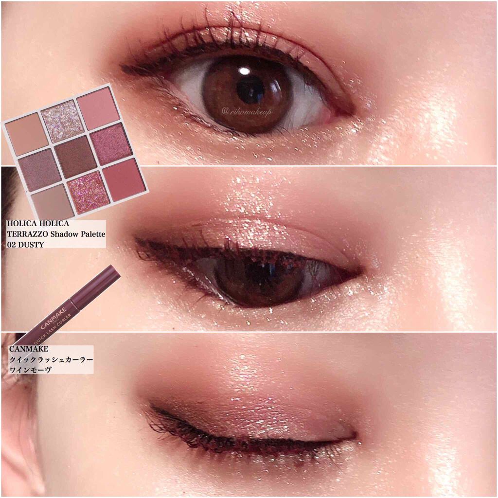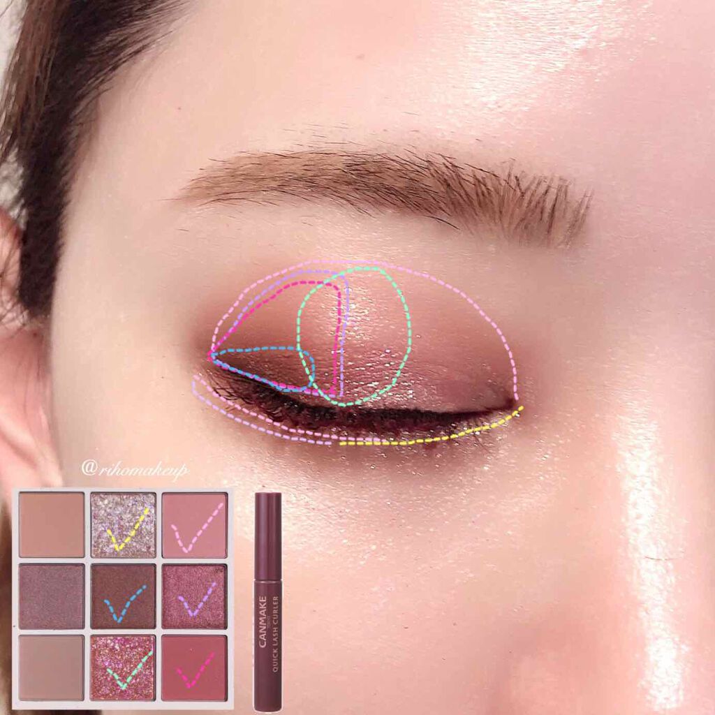HOLIKAHOLIKAマイフェイブムードアイパレット9カラー07SHELLINTHESEA目頭へ、くの字にクリーミータッチライナーを入れて黒眼下からアイラインまでも締め色を繋げています。締め色が濃いからナチュラルメイクはアイラインを引かなく...