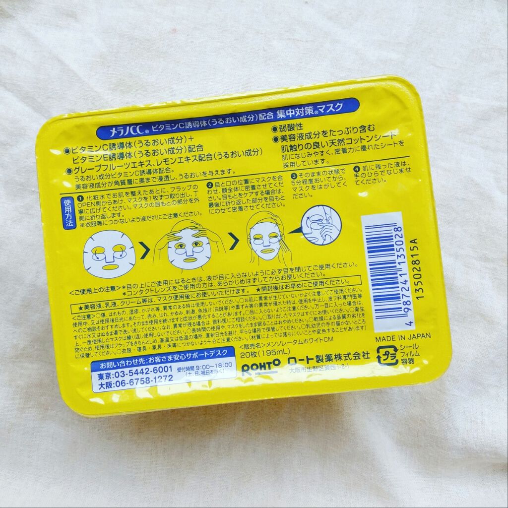 美容液が大人気のメラノCCシリーズのシートマスクです。 天然コットン100%のシートだから肌に摩擦を感じない柔らかさ。 浸透の良いビタミンC誘導体が配合。 手軽な保湿ケアができる。 洗顔後すぐに貼るのではなく、化粧水つけてから貼らなくてはならない。