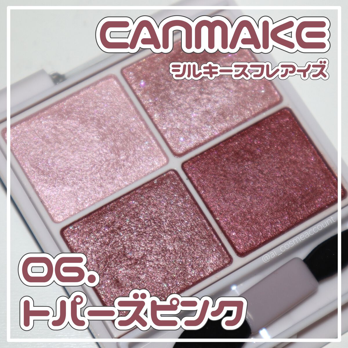 キャンメイクシルキースフレアイズ06トパーズピンク¥825◇質感(パール4)光沢感のあるパールに少しラメが入っていて輝き方がとっても綺麗です💎メタリックほどの光沢感はありませんが、ラメほどキラキラした感じも強くなく、本当に絶妙な質感をしていま...