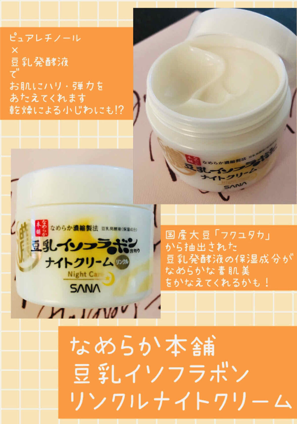 - リンクルラインからナイトクリームが新登場! ピュアレチノール*1を新配合の濃厚クリームが一晩かけて密着して浸透*2する、おやすみパック処方です。 商品特徴 〔 ①ピュアレチノール*1×豆乳発酵液*1配合で本格スキンケア 〕 『なめらか本舗』オリジナルのイソフラボン含有の豆乳発酵液*1に加え、ピュアレチノール*1を新配合! お肌にハリ・弾力感を与えます。 〔 ②夜のしっかりケアで乾燥による小じわを目立たなくします*3! 〕 肌ストレスの少ない夜のお手入れをおすすめします。 新登場のナイトクリームはおやすみパック処方を採用し、濃厚なクリームが一晩中肌に密着しつつ、乾燥による小じわ目立たなくします。 〔 ③3ステップの重ね技ケア! 〕 化粧水、乳液も新テクスチャーで保湿感がパワーアップ! リンクルライン3品一緒に使用するのがおすすめです。 *1 保湿成分 *2 角層まで *3 効能評価試験済み