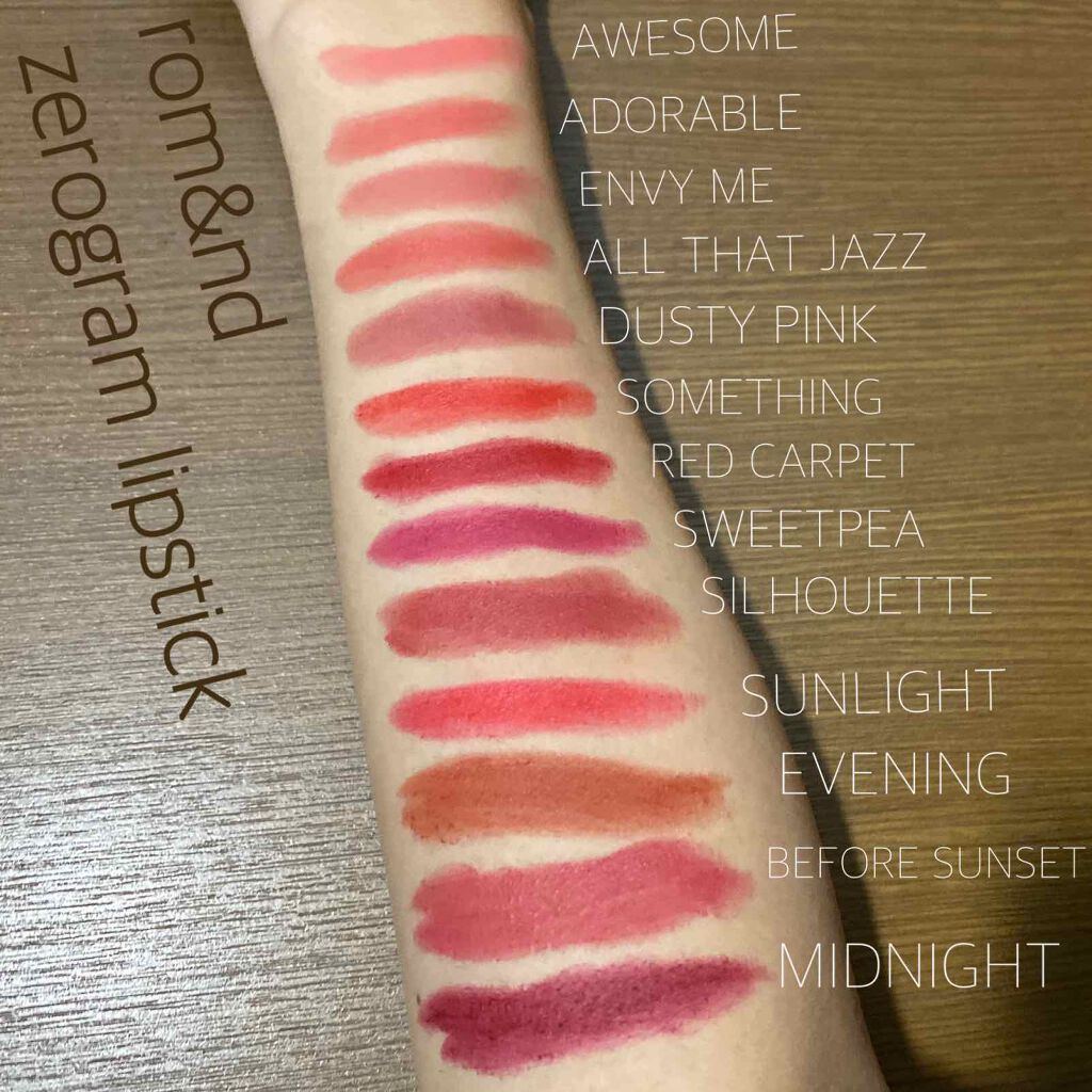 rom&ndのマットリップスティックゼログラム、ENVYMEのスウォッチです🎀❤️⋱⋰⋱⋰⋱⋰⋱⋰⋱⋰⋱⋰⋱⋰⋱⋰⋱⋰⋱⋰⋱⋰⋱⋰rom&ndマットリップスティックゼログラムENVYME全13色展開(うち5色は新色☆)☆Sillouette☆...