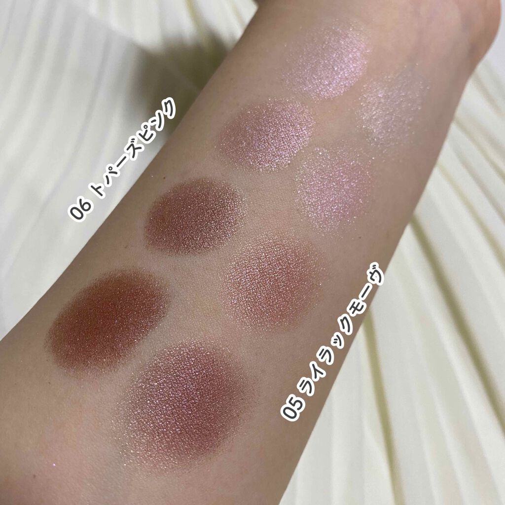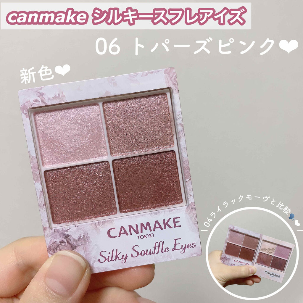 キャンメイクシルキースフレアイズ06トパーズピンク¥825◇質感(パール4)光沢感のあるパールに少しラメが入っていて輝き方がとっても綺麗です💎メタリックほどの光沢感はありませんが、ラメほどキラキラした感じも強くなく、本当に絶妙な質感をしていま...