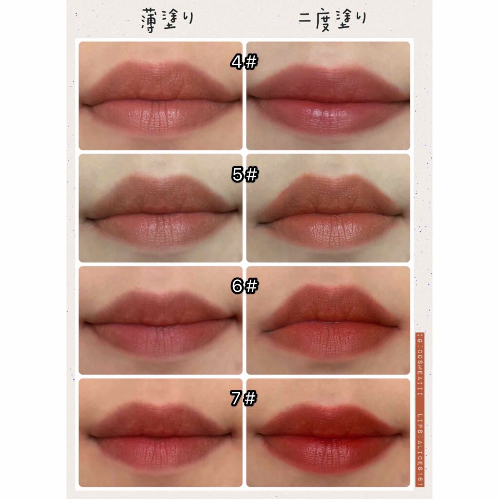 カラー:ペタルマットなリップを探していて出会いました。サラサラとしたつけ心地で、塗った後もつけてる感じがしません。かなり軽いつけ心地です。マットなのに程よいツヤ感もあり発色もかなり良いです。飲み物を飲むとコップのフチについてしまいますが、くち...
