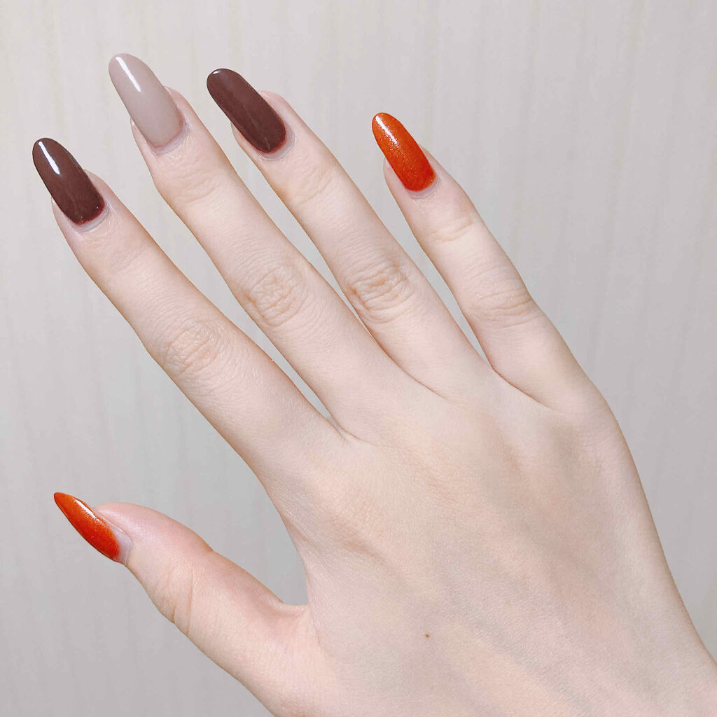 やってみたかった白べっ甲にラテカラーを合わせてほっこり落ち着いた秋ネイルにしてみました😚☁️ 落ち着いた色味にキラキラ排除で断然秋っぽくなりますね🌾 Ducatoのラテネイルは2色とも2020年の限定色でどちらも復刻&定番化してほしいカラーです🥹 ミルクティーのグレージュとエスプレッソのダークブラウンが相性抜群◎ N124は紅茶好きには特に刺さるネーミングです…