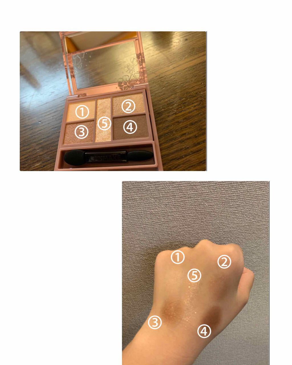 - 1枚のパレットで2つのスタイルが完成! 5色の欲ばりアイシャドウ♥ メインカラーを選んで2つのスタイルが楽しめる! A→B→D でスタイル1 A→C→D でスタイル2 繊細な粉質が、しっとりとまぶたに密着して色落ちを防ぎます。 透明感のあるキラうるトッピングジュエル(繊細ラメ)は、気分によってトッピング!