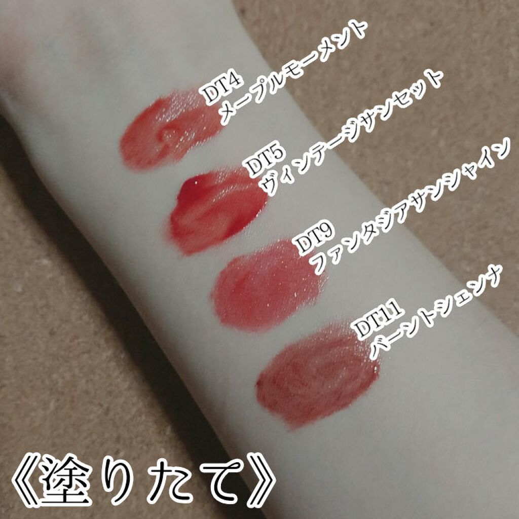 カラバリ豊富でうるうるとした水光ティントです!! 仕上がりがすっごく綺麗でびっくりしました! 唇の縦じわが今までで1番消えたかも…! どれもほんっっとうに可愛いです😍 中でもお気に入りはDT1,DT3,DT4,DT7!! その日のメイクに合わせて今日はこれ!って選べるので楽しいです♪ とってもおすすめなのでぜひみなさんも買ってみてください~!
