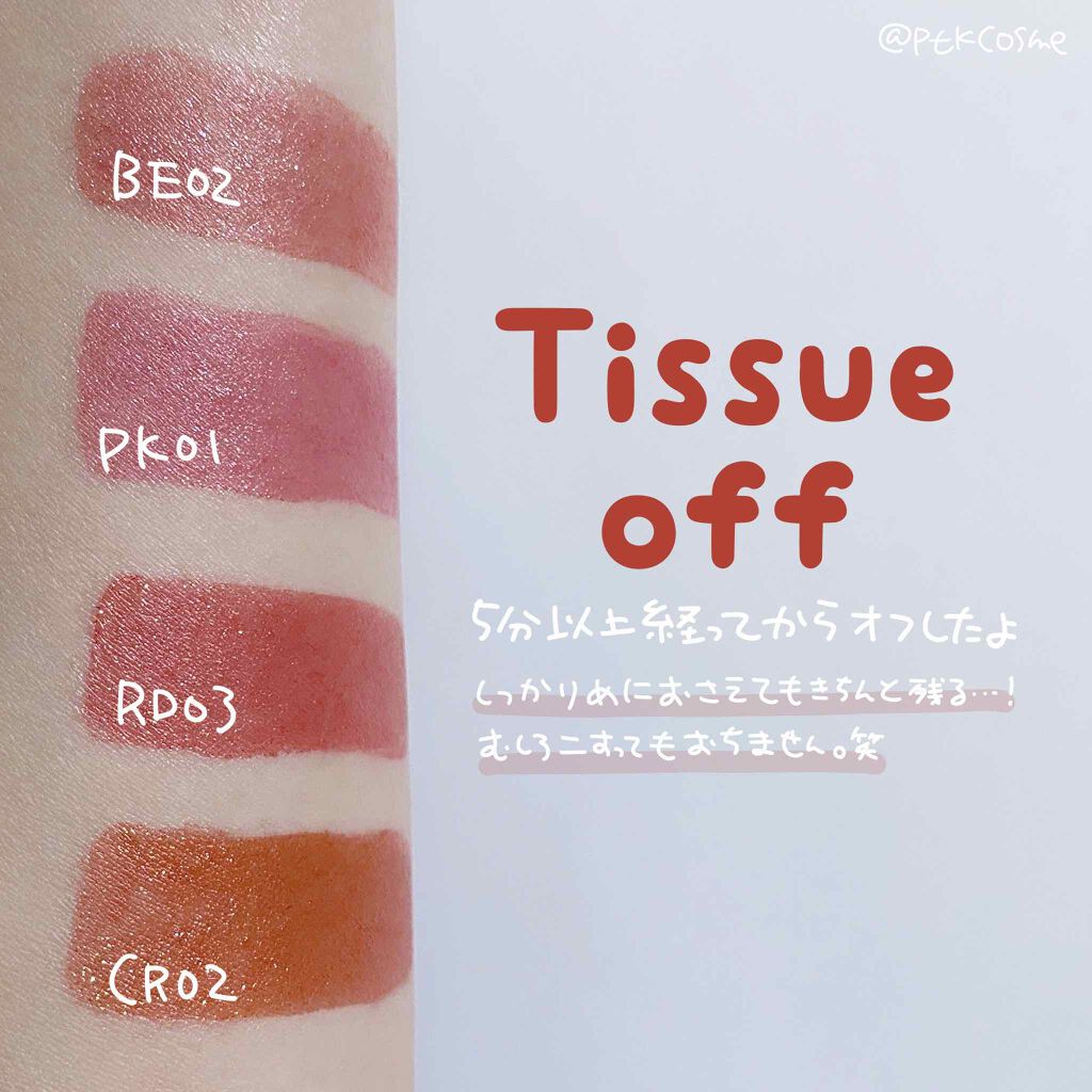 - Point 1 ジューシーなもぎたて果実のような発色が長時間続く Point 2 キラキラ輝くスパークリングジュエリーパウダー配合 Point 3 リップケアオイル配合で、クリアな光沢感のある仕上がり RD03、CR02は公式オンライン限定発売