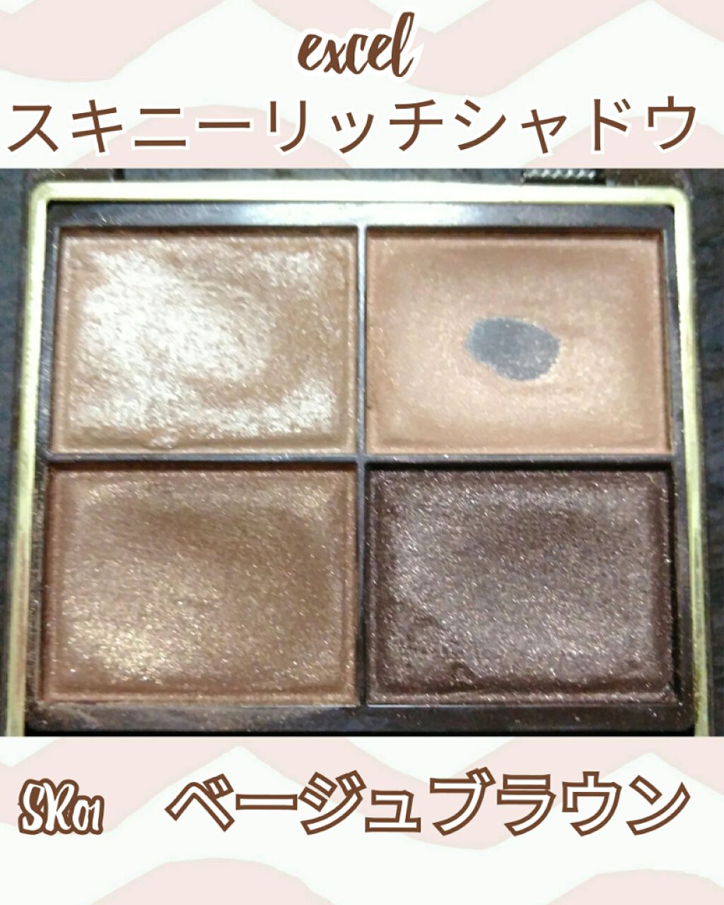 excelスキニーリッチシャドウSR01ベージュブラウン〜商品説明〜4色を順番に重ねるだけで、作り込んだようなリッチなグラデーションを実現する、肌なじみのよいアイシャドウしっとりリッチな質感ながら、するするとのびてまぶたと一体化するようにピタ...