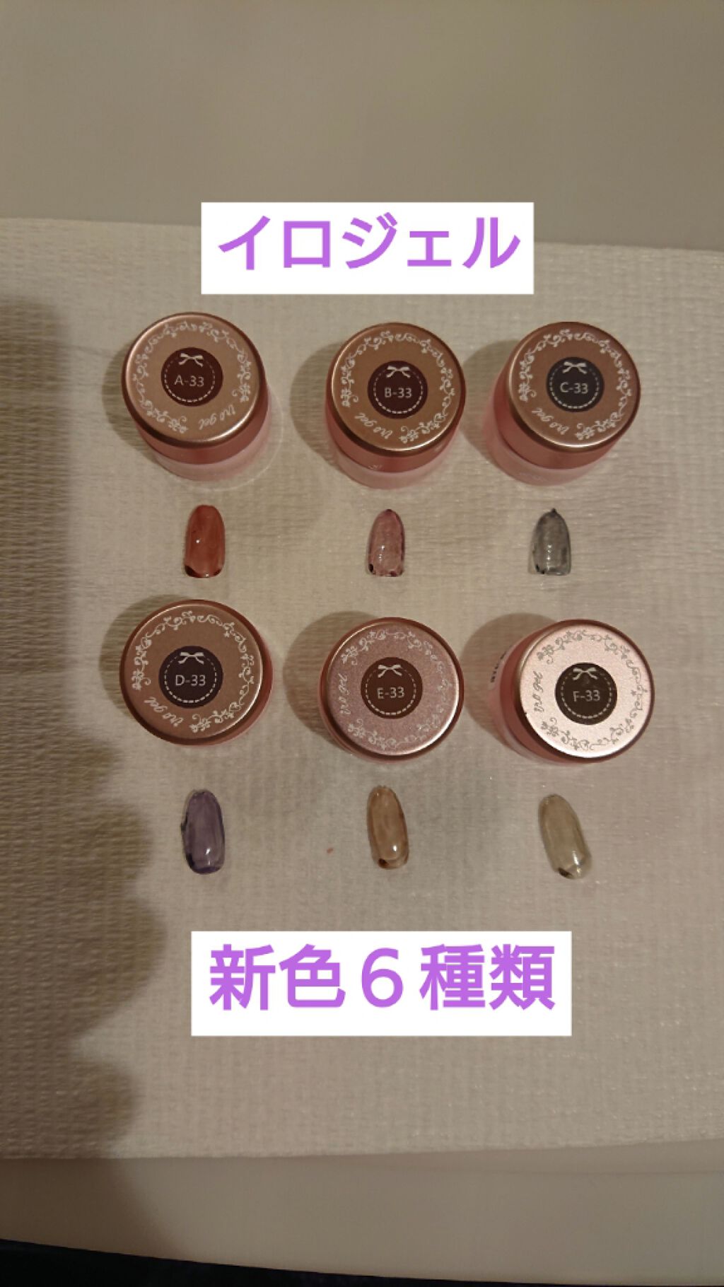 たまごです。今日買ってきたジェルのカラチャート作りました。上から見えるように作りました。YouTubeでダイソーのクッションゴムがいいとみて友達が一緒に探してくれてすぐみつけてくれまして、1個に、14個入りで、それを5個買ってきました。セリア...