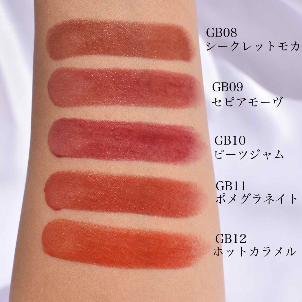 - <GB03 アプリコットシナモン> リンゴ酸ジイソステアリル、テトラエチルヘキサン酸ペンタエリスリチル、トリイソステアリン酸ポリグリセリル-2、水添ポリイソブテン、ヒドロキシアルキル(C16-18)ヒドロキシダイマージリノレイルエーテル、ワセリン、ポリエチレン、キャンデリラロウエステルズ、マイクロクリスタリンワックス、水添ポリデセン、アルガニアスピノサ核油、セラミドEOP、セラミドNG、セラミドNP、セラミドAP、水添レシチン、ダイズステロール、(HDI/トリメチロールヘキシルラクトン)クロスポリマー、カプリル酸グリセリル、トコフェロール、硫酸Ba、(+/-) シリカ、ラウロイルリシン、黄4、黄5、酸化チタン、酸化鉄、水酸化Al、青1、赤104(1)、赤201、赤202 <GB06 ショコラベリー> テトラエチルヘキサン酸ペンタエリスリチル、リンゴ酸ジイソステアリル、トリイソステアリン酸ポリグリセリル-2、水添ポリイソブテン、ヒドロキシアルキル(C16-18)ヒドロキシダイマージリノレイルエーテル、ワセリン、ポリエチレン、キャンデリラロウエステルズ、マイクロクリスタリンワックス、水添ポリデセン、アルガニアスピノサ核油、セラミドEOP、セラミドNG、セラミドNP、セラミドAP、水添レシチン、ダイズステロール、(HDI/トリメチロールヘキシルラクトン)クロスポリマー、カプリル酸グリセリル、トコフェロール、硫酸Ba、シリカ、ラウロイルリシン、黄4、黄5、酸化チタン、酸化鉄、水酸化Al、青1、赤201、赤202 <GB08 シークレットモカ> リンゴ酸ジイソステアリル、テトラエチルヘキサン酸ペンタエリスリチル、トリイソステアリン酸ポリグリセリル-2、水添ポリイソブテン、ヒドロキシアルキル(C16-18)ヒドロキシダイマージリノレイルエーテル、ワセリン、ポリエチレン、キャンデリラロウエステルズ、マイクロクリスタリンワックス、水添ポリデセン、アルガニアスピノサ核油、セラミドEOP、セラミドNG、セラミドNP、セラミドAP、(HDI/トリメチロールヘキシルラクトン)クロスポリマー、カプリル酸グリセリル、トコフェロール、フィトステロールズ、水添レシチン、硫酸Ba、(+/-) シリカ、ラウロイルリシン、黄4、黄5、酸化チタン、酸化鉄、水酸化Al、青1、赤104(1)、赤201、赤202 <GB09 セピアモーヴ> リンゴ酸ジイソステアリル、テトラエチルヘキサン酸ペンタエリスリチル、トリイソステアリン酸ポリグリセリル-2、水添ポリイソブテン、ヒドロキシアルキル(C16-18)ヒドロキシダイマージリノレイルエーテル、ワセリン、ポリエチレン、キャンデリラロウエステルズ、マイクロクリスタリンワックス、水添ポリデセン、アルガニアスピノサ核油、セラミドEOP、セラミドNG、セラミドNP、セラミドAP、(HDI/トリメチロールヘキシルラクトン)クロスポリマー、カプリル酸グリセリル、トコフェロール、フィトステロールズ、水添レシチン、硫酸Ba、(+/-) シリカ、ラウロイルリシン、黄4、黄5、酸化チタン、酸化鉄、水酸化Al、青1、赤104(1)、赤201、赤202 <GB11 ポメグラネイト> テトラエチルヘキサン酸ペンタエリスリチル、リンゴ酸ジイソステアリル、トリイソステアリン酸ポリグリセリル-2、水添ポリイソブテン、ヒドロキシアルキル(C16-18)ヒドロキシダイマージリノレイルエーテル、ワセリン、ポリエチレン、キャンデリラロウエステルズ、マイクロクリスタリンワックス、水添ポリデセン、アルガニアスピノサ核油、セラミドEOP、セラミドNG、セラミドNP、セラミドAP、(HDI/トリメチロールヘキシルラクトン)クロスポリマー、カプリル酸グリセリル、トコフェロール、フィトステロールズ、水添レシチン、硫酸Ba、(+/-) シリカ、ラウロイルリシン、黄4、黄5、酸化チタン、酸化鉄、水酸化Al、青1、赤201、赤202 <GB12 ホットカラメル> リンゴ酸ジイソステアリル、テトラエチルヘキサン酸ペンタエリスリチル、トリイソステアリン酸ポリグリセリル-2、水添ポリイソブテン、ヒドロキシアルキル(C16-18)ヒドロキシダイマージリノレイルエーテル、ワセリン、ポリエチレン、キャンデリラロウエステルズ、マイクロクリスタリンワックス、水添ポリデセン、アルガニアスピノサ核油、セラミドEOP、セラミドNG、セラミドNP、セラミドAP、(HDI/トリメチロールヘキシルラクトン)クロスポリマー、カプリル酸グリセリル、トコフェロール、フィトステロールズ、水添レシチン、硫酸Ba、(+/-) シリカ、ラウロイルリシン、黄4、黄5、酸化チタン、酸化鉄、水酸化Al、青1、赤104(1)、赤201、赤202 <GB01 レッドガーネット> リンゴ酸ジイソステアリル、テトラエチルヘキサン酸ペンタエリスリチル、トリイソステアリン酸ポリグリセリル-2、水添ポリイソブテン、ヒドロキシアルキル(C16-18)ヒドロキシダイマージリノレイルエーテル、ワセリン、ポリエチレン、キャンデリラロウエステルズ、マイクロクリスタリンワックス、水添ポリデセン、アルガニアスピノサ核油、セラミドEOP、セラミドNG、セラミドNP、セラミドAP、水添レシチン、ダイズステロール、(HDI/トリメチロールヘキ