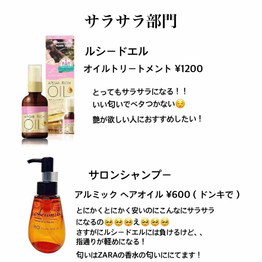 | ヘアケア・スタイリングランキング第55位 | いいオイル!ブリーチで傷んでる髪もまとまってくれる♡指通りサラサラ♡ | 詳細を見る | |