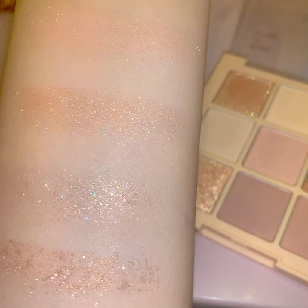 デイジークのアイシャドウパレット#03NudePotionです。2枚目からは、フラッシュ有りで撮影してます。粉質はだいたいがサラッとしていますが、大粒のグリッターは、しっとりとしていてまぶたに密着します!細かいラメはさらっさらで、上品に仕上が...