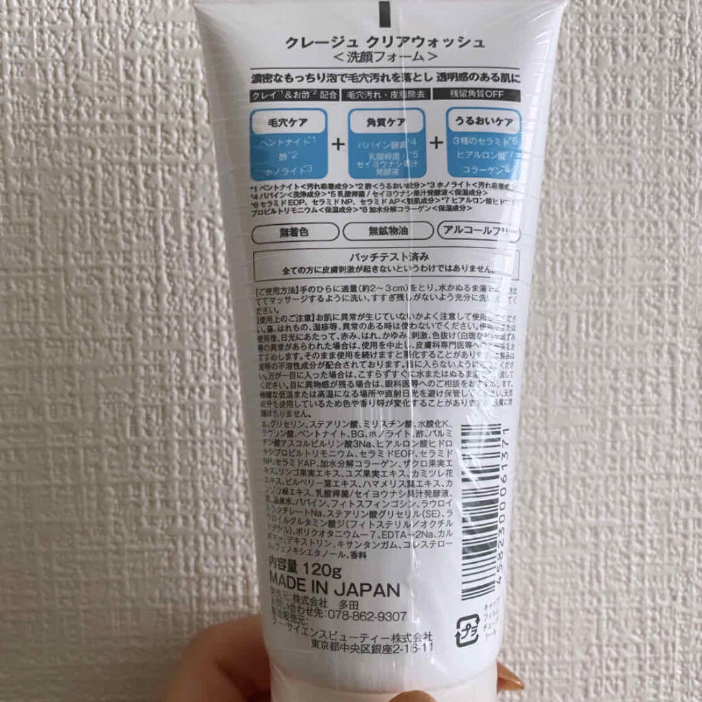 CLAYGEクリアウォッシュ【使った商品】クレージュクリアウォッシュ【商品の特徴】¥1,100円(税込)120g天然クレイ×お酢配合パパイン酵素機能性の異なる2種のクレイお酢成分3種のヒト型セラミドビタミンC誘導体配合合成着色料鉱物油紫外線吸...