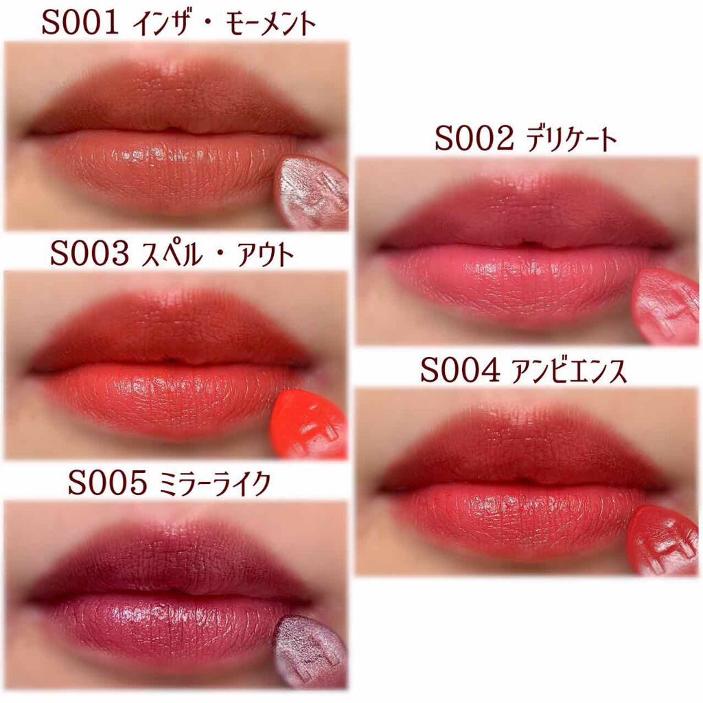 - <S001 インザモーメント> ヒマシ油、トリ(カプリル酸/カプリン酸)グリセリル、水添ロジン酸メチル、水添ポリイソブテン、マイクロクリスタリンワックス、マイカ、キャンデリラロウ、ジ安息香酸PG、リンゴ酸ジイソステアリル、酸化チタン、酸化鉄、トリイソステアリン酸ポリグリセリル-2、イソステアリン酸ソルビタン、(VP/ヘキサデセン)コポリマー、ポリエチレン、酢酸ジステアリン酸スクロース、赤202、ジイソステアリン酸ポリグリセリル-2、ラウロイルリシン、青1、香料、カプリリルグリコール、カプリル酸グリセリル、トリエトキシカプリリルシラン、ダイマージリノール酸ダイマージリノレイルビス(ベヘニル/イソステアリル/フィトステリル) <S005 ミラーライク> ヒマシ油、トリ(カプリル酸/カプリン酸)グリセリル、水添ロジン酸メチル、水添ポリイソブテン、マイクロクリスタリンワックス、マイカ、キャンデリラロウ、ジ安息香酸PG、合成フルオロフロゴパイト、トリイソステアリン酸ポリグリセリル-2、イソステアリン酸ソルビタン、(VP/ヘキサデセン)コポリマー、ポリエチレン、ホウケイ酸(Ca/チタン)、酸化チタン、リンゴ酸ジイソステアリル、赤227、黄4、酢酸ジステアリン酸スクロース、赤202、ジイソステアリン酸ポリグリセリル-2、酸化鉄、ラウロイルリシン、香料、カプリリルグリコール、カプリル酸グリセリル、トリエトキシカプリリルシラン、酸化スズ、ダイマージリノール酸ダイマージリノレイルビス(ベヘニル/イソステアリル/フィトステリル)