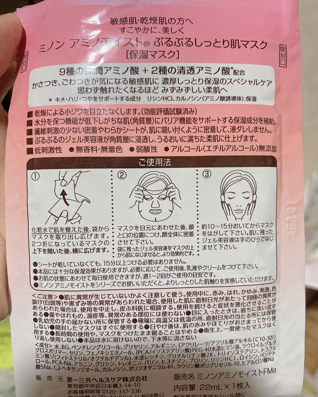 - 思わず触れたくなるほどみずみずしい肌へ。うるおって透明感。 乾燥による小ジワを目立たなくします(効能評価試験済み) 水分を保つ機能が低下しがちな角質層に、バリア機能をサポートする保湿成分を補給 ぷるぷるジェルがしみこんだ密着やわらかシートで、液ダレしません ◎ミノン アミノモイストのシートマスクは化粧水で肌を整えた後にお使いいただく「美容液マスク」です。 週に1-2回のスペシャルケアとしておすすめです♪