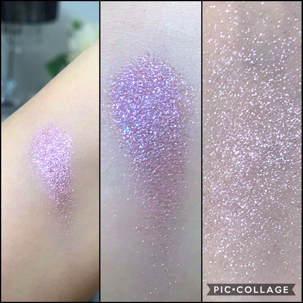 イリデッセントピンク&ゴールドスパークル。透明感のある青みピンクベースにゴールドラメが含まれていてめちゃくちゃ可愛い! 一度塗りだと淡めでキラキラ。重ねて塗ると色みが出てきます。 涙袋に使っても可愛いカラーです◡̈