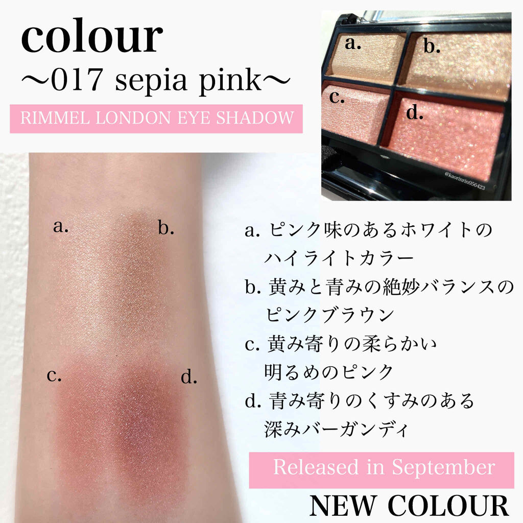 - スモーキーで上品な発色と輝きで、魅惑的で深みのある大人レディな目元を演出するセットアイカラー。 ●薄膜で透明感のある仕上がり 透明感の高い板状の粉体を多く使用しているため、まぶたの上に薄く均一にスルスルと広がります。また、カバー力の高い白い粉体が少ないため、薄膜で透明感のある仕上がりを実現します。 ●クリアな美しい発色 カバー力の高い白い粉体の配合量を抑えたことにより、顔料がクリアに発色。特に、従来*よりも顔料が高配合されているB・C・D 色は、透明感を保ちながらしっかりと美しい発色を実現します。*リンメルブランド内において ●くすみにくく、つけたての発色が持続 水や油をはじくシリコーン系の油を多く使用しているため、顔料が水に濡れにくく、長時間つけたての発色をキープ。くすみにくく、美しい発色が持続します。 ●しっとりやわらかなタッチ 高配合されたソフトで弾力性のあるシリコーンゲルにより、しっとりとしたやわらかい感触です。 ●無香料