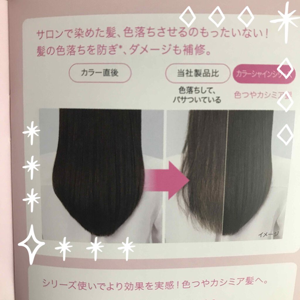 - サロンでカラーした髪、色落ちさせるなんてもったいない!30日間、試して。 色つやカシミア髪へ。 カラーした髪の色落ちとダメージに*。 やさしく洗う、サルフェート無添加のシャンプーでキューティクルを傷つけにくく色落ちをおだやかに。高級美容液配合のトリートメントが髪の奥に浸透し、カラーによって起きた髪のダメージを補修。ローズとジャスミンをブレンドした上質な香り。 * シリーズ使いによる