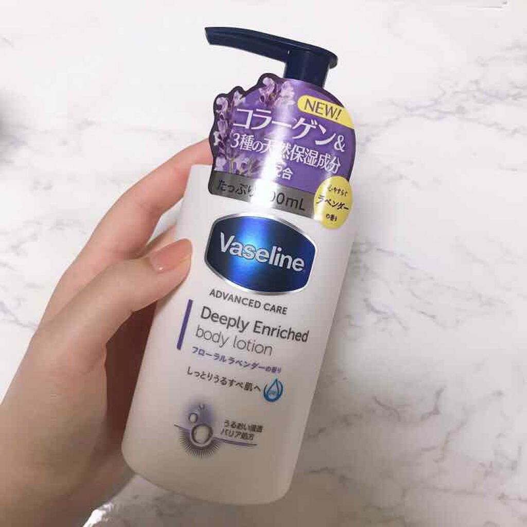 - ヴァセリンジェリー*1高配合の高保湿ボディローションで、うるすべ肌が一日*2続きます。 ・コラーゲン*3に加え、カレンデュラエッセンス、オーガニックホホバオイル、オーガニックシアバターの3種の天然保湿成分を配合。 ・ラベンダーエッセンシャルオイル*4を配合した、心やすらぐフローラルラベンダーの香り ・スーッと肌*5に浸透してベタつかないのに、肌にしっかりうるおいを与えます。 *1: ワセリン:うるおい成分 *2: ユニリーバ・ジャパン調べ *3: うるおい成分 *4: 香り成分 *5: 角質層まで