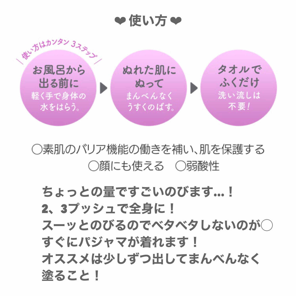 | ボディケアランキング第11位 | なめらかですーっと肌にもなじんでくれるから全身にも塗りやすいよ🙆♀️ | 詳細を見る | |