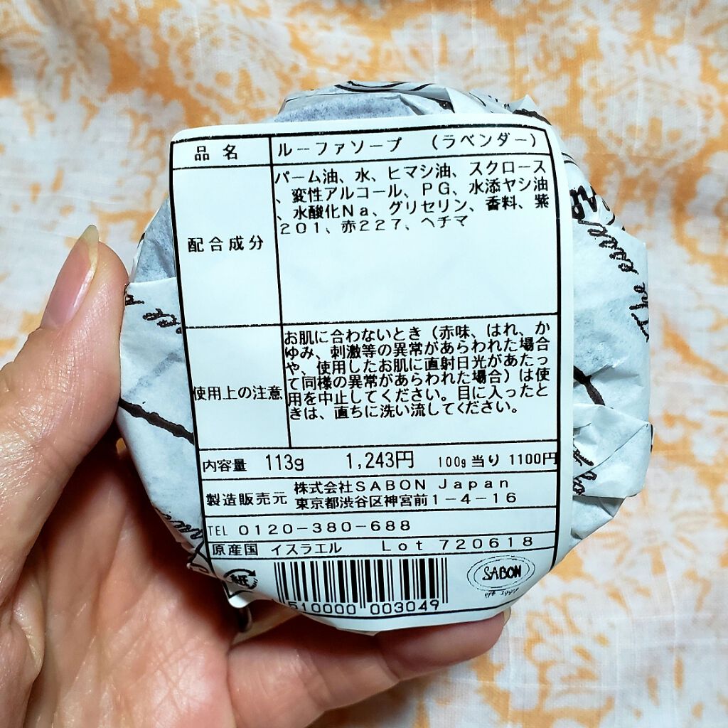 こちら、SABONの店頭のレジ横によく置いてある、あの石鹸です笑100gから購入でき、お店の人に声をかけるとその場で言ったg数に切って貰える、量り売りです。(100gあたり1000円ほど🫢←SABON製品の中ではかなりお得❣️)《使用感、感想...