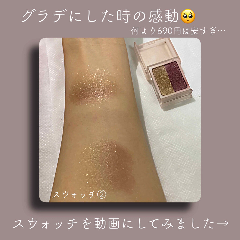 しっとりしたツヤ感のあるクリームタイプのアイシャドウ。塗ってしばらくするとサラサラのパウダーに変化するのでペタつきは少なめ。 単色でパパッと上瞼に広げ、二重幅にだけ重ねるだけでナチュラルに仕上がるので時短メイクに良き◎ 指塗りが一番均一で綺麗に仕上がるかな?二重線に溜まりやすい方は塗りすぎか、もしくはアイベースを仕込むといいかもです☝️