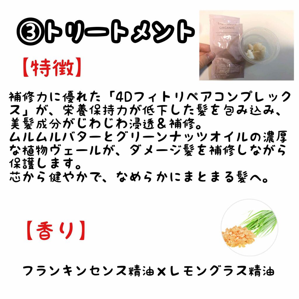 - <シャンプー> 水、チャ葉水*、コカミドDEA、ラウロイルメチルアラニンNa、コカミドプロピルベタイン、ラウラミドプロピルベタイン、ココイルメチルタウリンNa、ココイルグルタミン酸TEA、ラウラミドプロピルヒドロキシスルタイン、ニュウコウジュ油、イランイラン花油、ニオイテンジクアオイ油、パルマローザ油、マヨラナ葉油、エンピツビャクシン油、ベルガモット果実油、オレンジ油、加水分解ダイズタンパク、クランベアビシニカ種子油、アストロカリウムムルムル種子脂、ジラウロイルグルタミン酸リシンNa、プルケネチアボルビリス種子油*、マカデミアナッツ脂肪酸エチル、ワサビノキ種子エキス、BG、クダモノトケイソウ種子油、ポリクオタニウム-10、ガーデニアタヒテンシス花エキス、カエサルピニアスピノサガム、プルーン種子油、ポリクオタニウム-7、マンゴー果実エキス*、安息香酸Na、リンゴ果実エキス*、クエン酸、カニナバラ果実エキス*、グリセリン、ビターオレンジ葉/枝油、セイヨウアカマツ葉油、ヤシ油、塩化Na、ヒマワリ種子油*、水酸化K、ユズ果皮油、EDTA-2Na、ヒノキ油、ライム油、ソルビン酸K、ユーカリ葉油、マルトデキストリン、アオモジ果実油、トコフェロール、ラバンデュラハイブリダ油、リンゴ酸、ベチベル根油、ローレル油 * オーガニック原料 <トリートメント> 水、チャ葉水*、パルミチン酸エチルヘキシル、ベヘニルアルコール、ステアロキシプロピルトリモニウムクロリド、グリセリン、イソステアリン酸水添ヒマシ油、ステアリルアルコール、セタノール、ニュウコウジュ油、レモングラス油、ベルガモット果実油、ニオイテンジクアオイ油、ビターオレンジ花油、レモン果皮油、加水分解ダイズタンパク、クランベアビシニカ種子油、アストロカリウムムルムル種子脂、ジラウロイルグルタミン酸リシンNa、プルケネチアボルビリス種子油*、マカデミアナッツ脂肪酸エチル、テリハボク種子油、カエサルピニアスピノサガム、ククイナッツ油、ダイマージリノール酸ジ(イソステアリル/フィトステリル)、メドウフォーム油、ステアリン酸グリセリル、バオバブ種子油*、BG、リンゴ果実エキス*、安息香酸Na、カニナバラ果実エキス*、クエン酸、ヒマワリ種子油*、ヒドロキシエチルセルロース、オレンジ油、フィチン酸、ラベンダー油、ソルビン酸K、アオモジ果実油、酸化銀、ローズマリー葉油、トコフェロール、タチジャコウソウ花/葉油、アルギニン、リンゴ酸、セイヨウハッカ油 * オーガニック原料