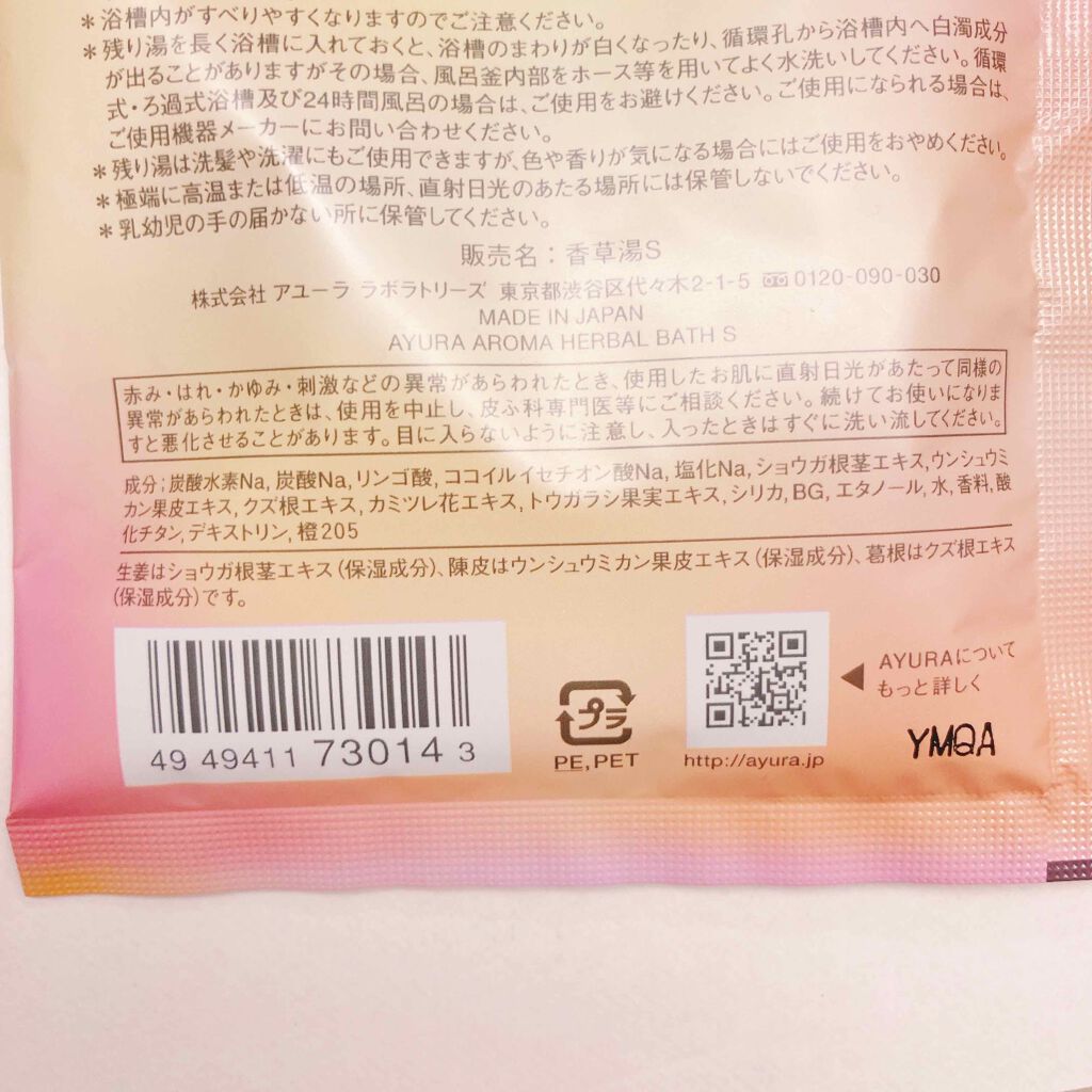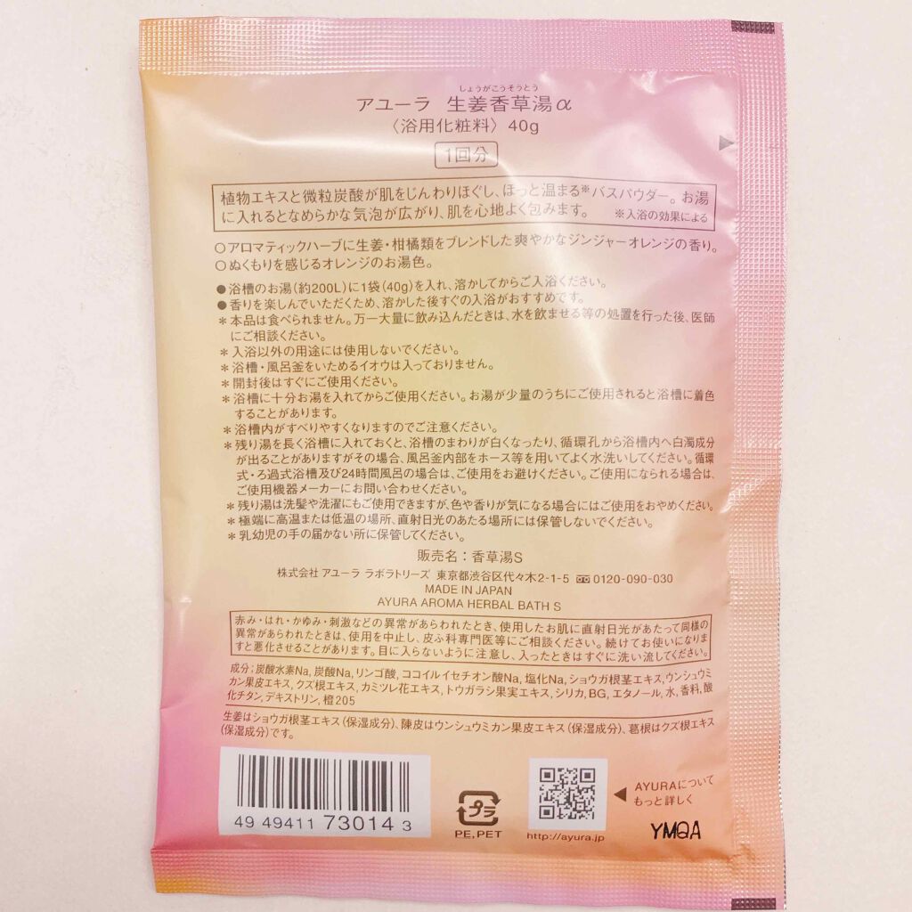 AYURAの【生姜香草湯α】アロマティックハーブに生姜・柑橘類をブレンドした爽やかなジンジャーオレンジの香り。 お湯に入れると気泡が広がり、お肌を包んでくれます。じんわりと温まるし*、一日の疲れが取れます…一日の疲れを癒してくれますよ…♡*...
