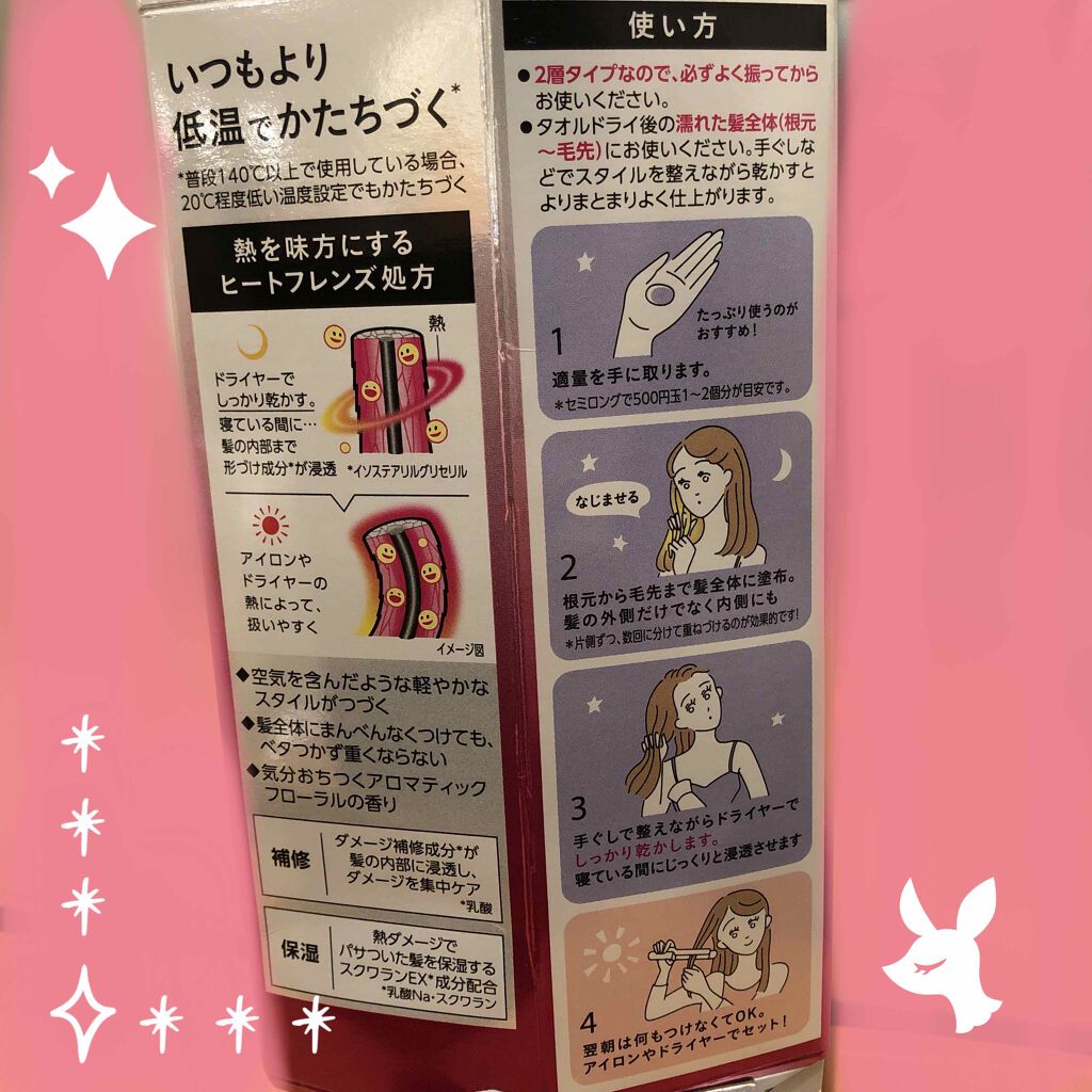 - 夜つけるだけ!朝いつもより低温でかたちづく*。熱を味方にするヒートフレンズ処方。空気を含んだような軽やかなスタイルがつづく。ベタつかず重くならない。●補修:ダメージ補修成分**が髪の内部に浸透し、ダメージを集中ケア。●保湿:熱ダメージでパサついた髪を保湿するスクワランEX***成分配合。*普段140℃以上で使用している場合**乳酸***乳酸Na・スクワラン