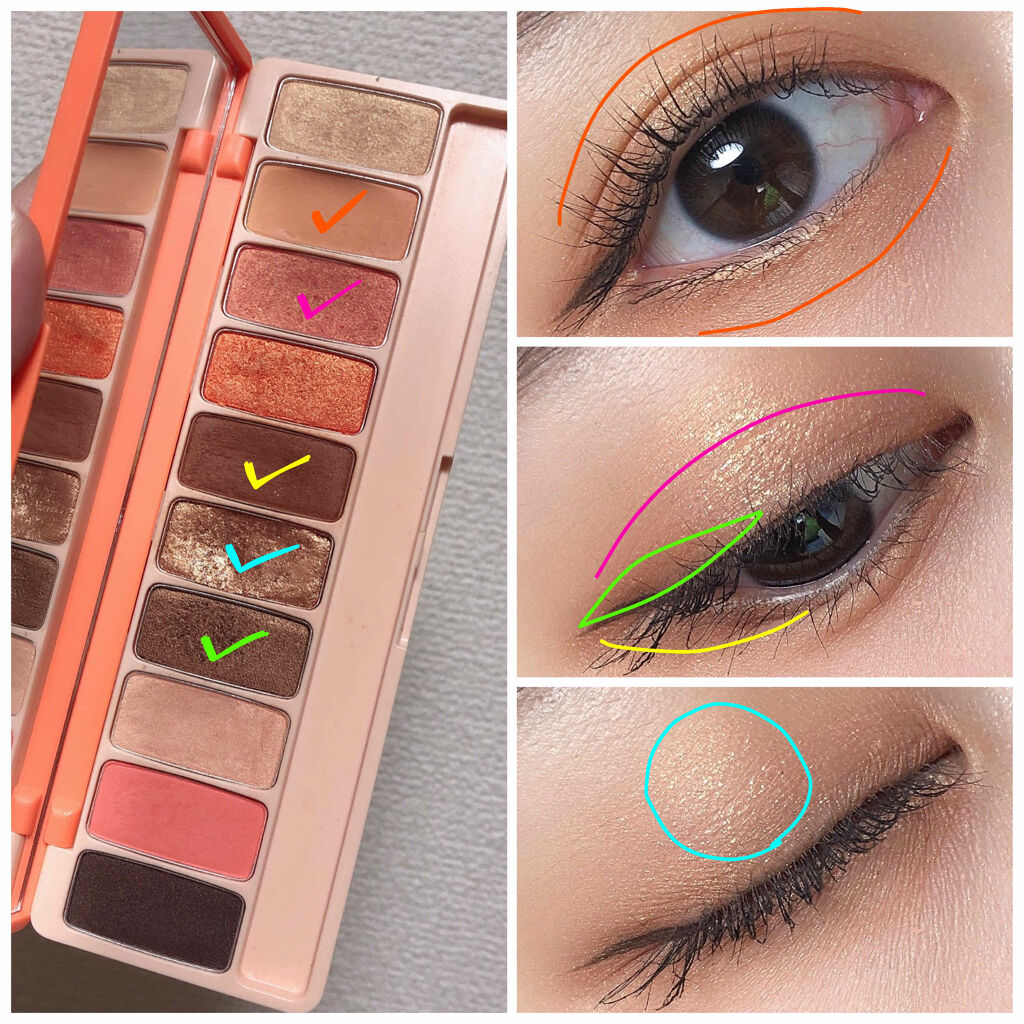 - 肌なじみの良い、鮮やかな発色で目元を華やかに彩る捨て色なしの10色アイシャドウパレット 異なる3種のテクスチャーを自由に組み合わせて、グラデーションも思いのままに。 NEW 2023.4 ・肌トーンにあう配色を詰め込んだトレンドカラー 肌トーンに合わせて、自分に似合うトレンドカラーが楽しめる♡ パーソナルカラー×トレンドカラーの掛け合わせパレットで、デイリーメイクもスペシャルメイクも気分にあわせてなりたい自分に! ・むにゅっとジェル質感ラメで高密着、煌めく目元 パレットの中でもポイントとなる大きめ粒子のラメは、ジェルのような新質感で落ちにくく肌にぴったりと密着します。キラキラとした目元をキープします。 ・使うカラーは大きめに!リアル捨て色なしパレット ベースやラメのよく使うカラーと締め色や濃い色等の減りが少ないカラーを異なるサイズで詰め込んだ、リアル捨て色なしパレット! <使用方法> 付属のデュアルシャドウブラシでベースカラーをまぶた全体に塗り広げます。細いブラシでグラデーションや目尻、アイライン、涙袋などのポイントカラーをのせて仕上げます。
