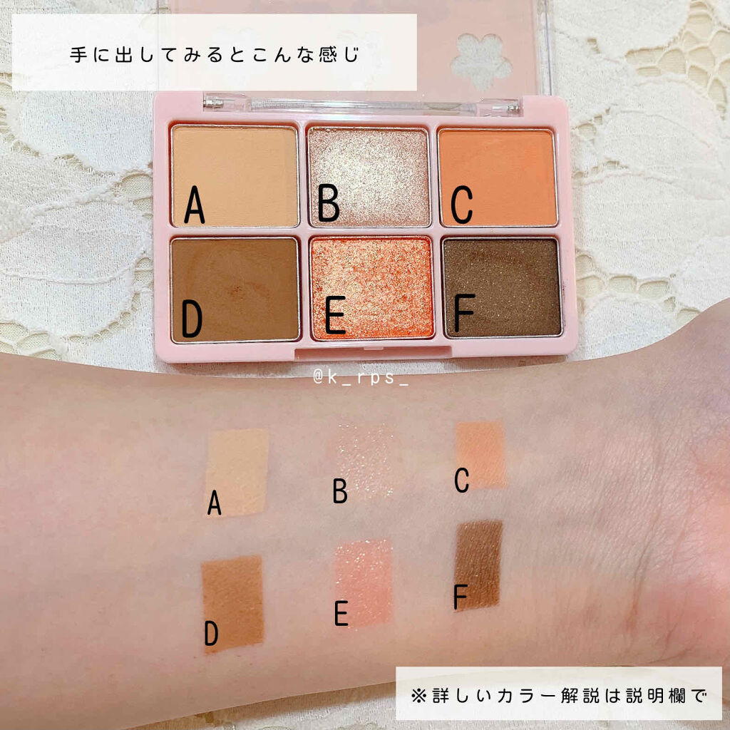 しっとり濡れた砂浜をイメージした陰影パレット。A.赤みが入ったくすみレンガみたいな色 B.薄い淡いくすみピンク C.Aよりは少し濃いくすみピンク D.黄み寄りベージュ E.くすみダークブラウン F.Eよりハッキリした焦げ茶 くすみピンクがものすごく可愛いマットアイシャドウ✨しっとりめで持ちも良い✴ ほんのり紫みがあるグレー💡リピートしようと思って、薬局行ったら売り場になくて、今は違うの使ってるけど、多分またリピートすると思う✨