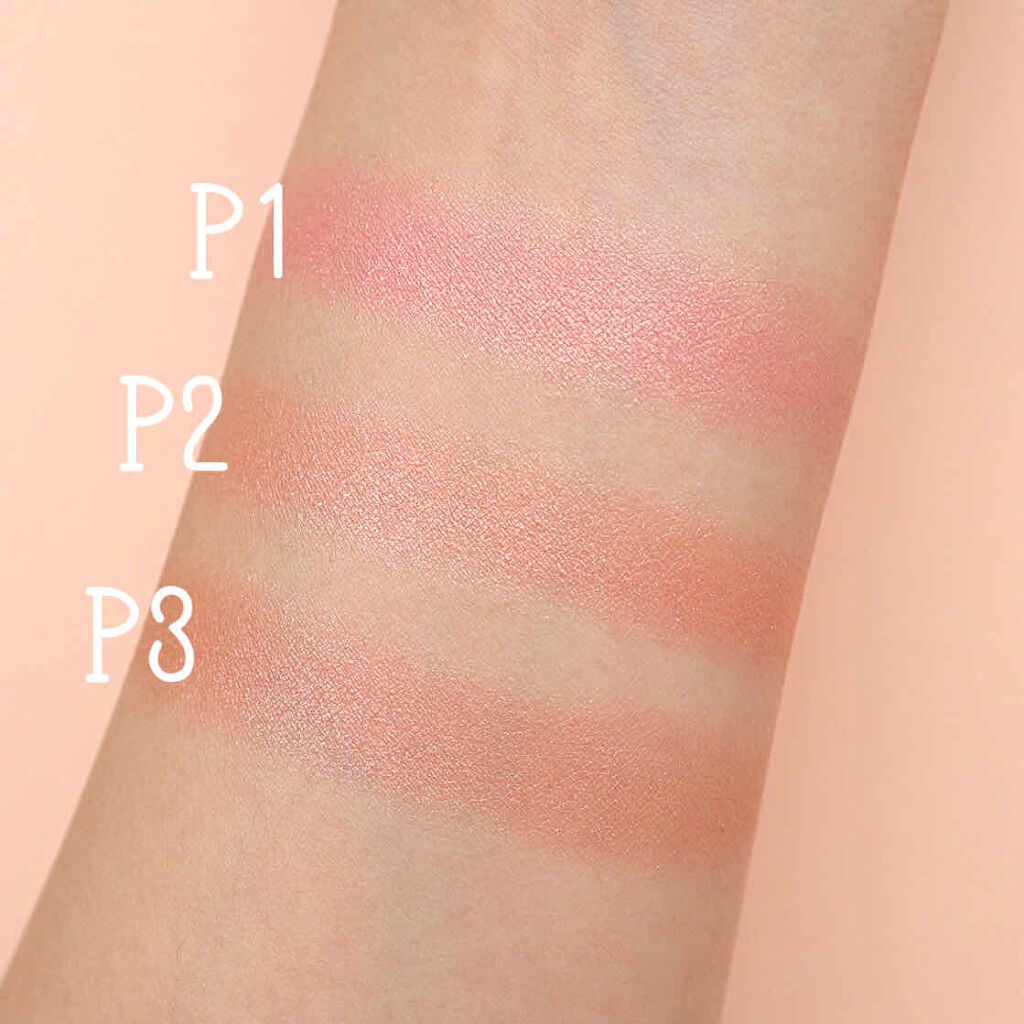 - <P1 ゴールドピーチ> トリイソステアリン酸ポリグリセリル-2、トリエチルヘキサノイン、(フッ化/水酸化/酸化)/(Mg/K/ケイ素)、ヘキサ(ヒドロキシステアリン酸/ステアリン酸/ロジン酸)ジペンタエリスリチル、ミリスチン酸亜鉛、リンゴ酸ジイソステアリル、(HDI/トリメチロールヘキシルラクトン)クロスポリマー、ペンチレングリコール、ビスジグリセリルポリアシルアジペート-2、フェノキシエタノール、ハイドロゲンジメチコン、メチルパラベン、シリカ、トコフェロール、カニナバラ果実油、スクワラン、ホホバ種子油、タルク、マイカ、合成フルオロフロゴパイト、酸化チタン、酸化鉄、赤202、黄4、酸化スズ、赤226、水酸化Al <P2 ベージュコーラル> トリイソステアリン酸ポリグリセリル-2、トリエチルヘキサノイン、(フッ化/水酸化/酸化)/(Mg/K/ケイ素)、ヘキサ(ヒドロキシステアリン酸/ステアリン酸/ロジン酸)ジペンタエリスリチル、ミリスチン酸亜鉛、リンゴ酸ジイソステアリル、(HDI/トリメチロールヘキシルラクトン)クロスポリマー、ペンチレングリコール、ビスジグリセリルポリアシルアジペート-2、フェノキシエタノール、ハイドロゲンジメチコン、メチルパラベン、シリカ、トコフェロール、カニナバラ果実油、スクワラン、ホホバ種子油、タルク、マイカ、合成フルオロフロゴパイト、酸化チタン、酸化鉄、酸化スズ、赤202、赤226、水酸化Al <P3 シナモンオレンジ> トリイソステアリン酸ポリグリセリル-2、トリエチルヘキサノイン、(フッ化/水酸化/酸化)/(Mg/K/ケイ素)、ヘキサ(ヒドロキシステアリン酸/ステアリン酸/ロジン酸)ジペンタエリスリチル、ミリスチン酸亜鉛、リンゴ酸ジイソステアリル、(HDI/トリメチロールヘキシルラクトン)クロスポリマー、ペンチレングリコール、ビスジグリセリルポリアシルアジペート-2、フェノキシエタノール、ハイドロゲンジメチコン、メチルパラベン、シリカ、トコフェロール、カニナバラ果実油、スクワラン、ホホバ種子油、タルク、合成フルオロフロゴパイト、マイカ、酸化チタン、酸化鉄、グンジョウ、酸化スズ、赤226、赤202、水酸化Al