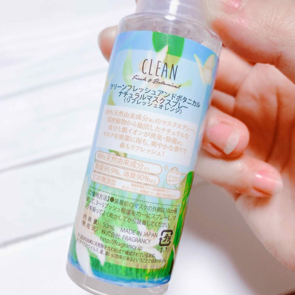クリーンフレッシュアンドボタニカルクリーンリネスルームスプレー・アエナにて安くなっていた為購入。・金木犀の香りが好きなので購入した。ただザ金木犀という香りではないかも。・リピートは有り。ただもっと好きな香りがあったらそっちを使うかも。以下サイ...