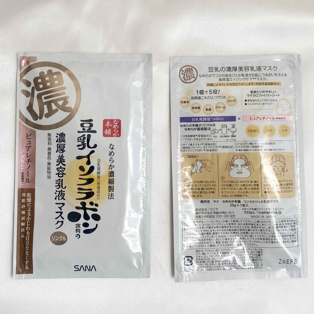 SANAなめらか本舗リンクルシートマスクN・以前lipsで購入したとき良かったのでリピート購入。・開けるて中を見ると液体がヒタヒタではなく、ジェル状の美容液がプルプルしていた。・使用後肌がぷるぷるになる。シートも空き部分が少ないので覆える面積...