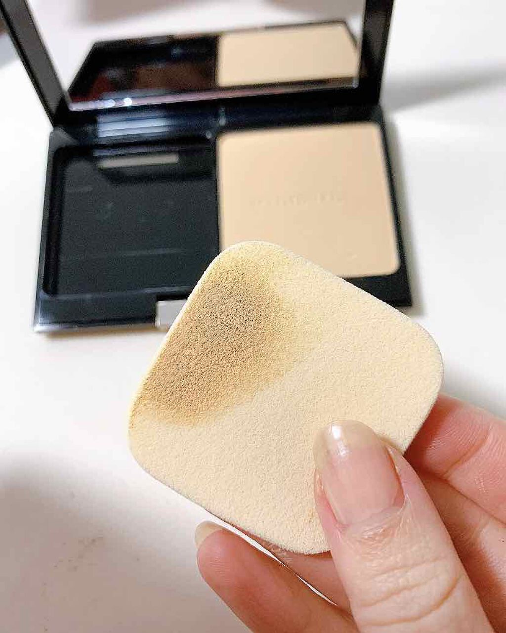 印象的な赤のパクト。 半透明感がかっこかわいい。 パフを手に取ってみると、ふかふか。 パフの先が尖っているから、細かいところも簡単に塗れるのが便利。 肌にのせてみると、しっとりジュワっと感があるのに、すぐに肌に密着。 カバー力もなかなか。 濃いシミや赤いニキビ跡は完全には消えないけど、色むらなんかは綺麗にカバー。 なのに自然。 厚塗り感が出ないから、元から肌が綺麗な人に魅せてくれるの。 つや感も良い感じ。 韓国系クッションファンデにありがちなテカテカにならないで、自然なツヤ。 そして1番のお気に入りポイントが崩れにくさ。 マスクをしてても汗かいてもキレイ。 多少のメイク落ちはあるけど、クッションファンデ特有のドロドロ感が無いの。