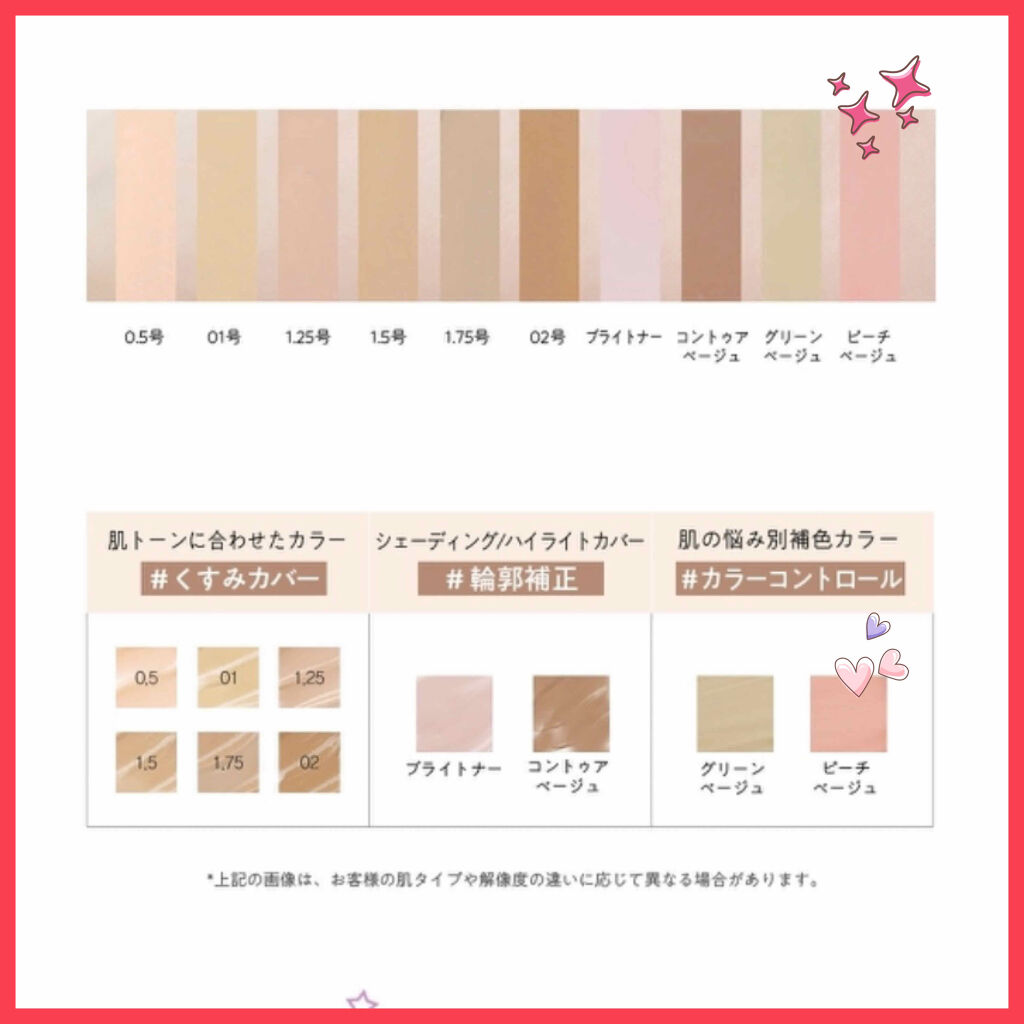- <0.5アイスベージュ> 酸化チタン,シクロペンタシロキサン,フェニルトリメチコン,タルク,BG,PVP,セチルPEG/PPG−10/1ジメチコン,Pigment Yellow 11,パーフルオロノニルエチルカルボキシデシルPEG−10ジメチコン,(ビニルジメチコン/メチコンシルセスキオキサン)クロスポリマー,アルニカ花エキス,ツボクサ葉エキス,酵母エキス,セイヨウノコギリソウエキス,オウシュウヨモギエキス,アロエベラ葉エキス,ゲンチアナ根エキス,クエン酸,カラミン,ジメチコン,エクトイン,塩化Na,エタノール,水酸化Al,グリセリン,ソルビン酸K,グリコーゲン,安息香酸Na,リン酸アスコルビルMg,ステアリン酸,マンニトール,トリエトキシカプリリルシラン,クロルフェネシン,フェノキシエタノール,ジステアルジモニウムヘクトライト,Pigment Black 11,Pigment Red 101,香料,水 <01クリアベージュ> 酸化チタン,シクロペンタシロキサン,フェニルトリメチコン,タルク,BG,PVP,セチルPEG/PPG−10/1ジメチコン,パーフルオロノニルエチルカルボキシデシルPEG−10ジメチコン,酸化鉄黄,ジステアルジモニウムヘクトライト,(ビニルジメチコン/メチコンシルセスキオキサン)クロスポリマー,オウシュウヨモギエキス,セイヨウノコギリソウエキス,アルニカ花エキス,ゲンチアナ根エキス,酵母エキス,ステアリン酸,リン酸アスコルビルMg,水酸化Al,マンニトール,塩化Na,メチルパラベン,ジメチコン,クロルフェネシン,トリエトキシカプリリルシラン,グリコーゲン,ブチルパラベン,Pigment Red 101,酸化鉄黒,香料,水 <1.25ライトベージュ> 酸化チタン,シクロペンタシロキサン,フェニルトリメチコン,タルク,BG,PVP,セチルPEG/PPG−10/1ジメチコン,Pigment Yellow 11,パーフルオロノニルエチルカルボキシデシルPEG−10ジメチコン,(ビニルジメチコン/メチコンシルセスキオキサン)クロスポリマー,アルニカ花エキス,ツボクサ葉エキス,酵母エキス,セイヨウノコギリソウエキス,オウシュウヨモギエキス,アロエベラ葉エキス,ゲンチアナ根エキス,クエン酸,カラミン,ジメチコン,エクトイン,塩化Na,エタノール,水酸化Al,グリセリン,ソルビン酸K,グリコーゲン,安息香酸Na,リン酸アスコルビルMg,ステアリン酸,マンニトール,トリエトキシカプリリルシラン,クロルフェネシン,フェノキシエタノール,ジステアルジモニウムヘクトライト,Pigment Black 11,Pigment Red 101,香料,水 <1.5ナチュラルベージュ> 酸化チタン,シクロペンタシロキサン,フェニルトリメチコン,タルク,酸化鉄黄,セチルPEG/PPG−10/1ジメチコン,BG,PVP,パーフルオロノニルエチルカルボキシデシルPEG−10ジメチコン,ジステアルジモニウムヘクトライト,(ビニルジメチコン/メチコンシルセスキオキサン)クロスポリマー,オウシュウヨモギエキス,セイヨウノコギリソウエキス,アルニカ花エキス,ゲンチアナ根エキス,酵母エキス,ステアリン酸,リン酸アスコルビルMg,水酸化Al,マンニトール,塩化Na,メチルパラベン,ジメチコン,クロルフェネシン,トリエトキシカプリリルシラン,グリコーゲン,ブチルパラベン,Pigment Red 101,酸化鉄黒,香料,水 <1.75ミドルベージュ> 酸化チタン,シクロペンタシロキサン,フェニルトリメチコン,タルク,Pigment Yellow 11,BG,PVP,セチルPEG/PPG−10/1ジメチコン,パーフルオロノニルエチルカルボキシデシルPEG−10ジメチコン,(ビニルジメチコン/メチコンシルセスキオキサン)クロスポリマー,オウシュウヨモギエキス,ツボクサ葉エキス,アロエベラ葉エキス,ゲンチアナ根エキス,アルニカ花エキス,セイヨウノコギリソウエキス,酵母エキス,エタノール,安息香酸Na,ソルビン酸K,カラミン,ステアリン酸,グリセリン,クロルフェネシン,グリコーゲン,ジメチコン,リン酸アスコルビルMg,塩化Na,マンニトール,ジステアルジモニウムヘクトライト,クエン酸,トリエトキシカプリリルシラン,フェノキシエタノール,水酸化Al,エクトイン,Pigment Red 101,Pigment Black 11,香料,水 <02リッチベージュ> 酸化チタン,シクロペンタシロキサン,フェニルトリメチコン,酸化鉄黄,タルク,セチルPEG/PPG−10/1ジメチコン,PVP,BG,パーフルオロノニルエチルカルボキシデシルPEG−10ジメチコン,ジステアルジモニウムヘクトライト,(ビニルジメチコン/メチコンシルセスキオキサン)クロスポリマー,オウシュウヨモギエキス,セイヨウノコギリソウエキス,アルニカ花エキス,ゲンチアナ根エキス,酵母エキス,ステアリン酸,リン酸アスコルビルMg,水酸化Al,マンニトール,塩化Na,メチルパラベン,ジメチコン,クロルフェネシン,トリエトキシカプリリルシラン,グリコーゲン,ブチルパラベン,Pigment Red 101,酸化鉄黒,香料,水 <2.25サンド> 酸化チタン,シクロペンタシロキサン,フェニルトリメチコン,タルク,酸化鉄黄,BG,PVP,セチルPEG/PPG−10/1ジメチコン,パーフルオロノニルエチルカルボキシデシルPEG−10ジメチコン,(ビニルジメチコン/メチコンシルセスキオキサン)クロスポリマー,Pigment Red 101,ゲンチアナ根エキス,アルニカ花エキス,アロエベラ葉エキス,酵母エキス,ツボクサ葉エキス,ニガヨモギエキス,セイヨウノコギリソウエキス,ステアリン酸,PG,グリコーゲン,クロルフェネシン,安息香酸Na,ク