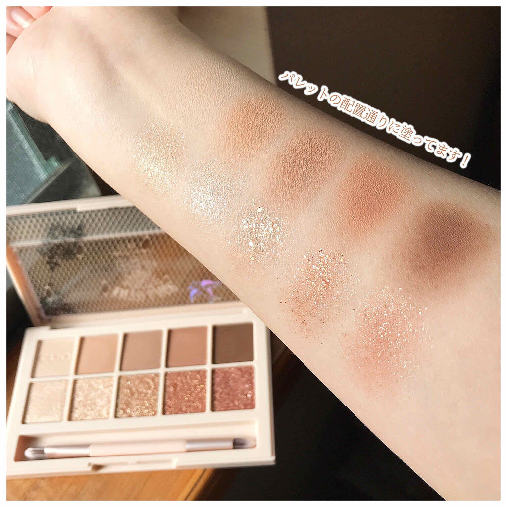 右上のベージュがまぶたを明るく整えてくれるおかげで次にのせる左下のカラーが綺麗に発色。 左上のぎっしり詰まったラメを涙袋に塗ると瞳がうるっとしているように見えて可愛いです ✧˖ 締色のブラウンにもパールが配合されているのでライン使いだけでなく、グラデーションになるように幅広めに塗っても素敵に仕上がります。 付属のダブルチップが少し柔らかめで肌あたりが良いところも ◎ どんなシーンでも使える、ベージュを基調としたナチュラルなカラーが揃ったパレットなのでひとつ持っておくとすごく便利です ˖ ࣪⊹