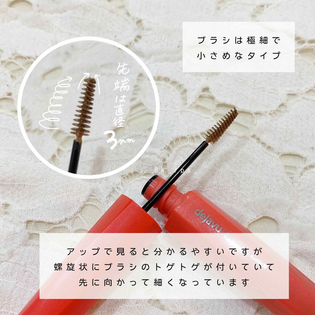1本1本色づき固まらない「フィルム眉カラー」 塗りやすい極小ブラシで簡単垢抜け✨ デジャヴュ独自の薄膜フィルムを採用。 毛がパリッと固まらず、タバやダマのないふんわり自然な眉に。 フィルムタイプで速乾性が高く、皮脂・汗・こすれに強いのに、お湯だけで簡単に落とせます✨