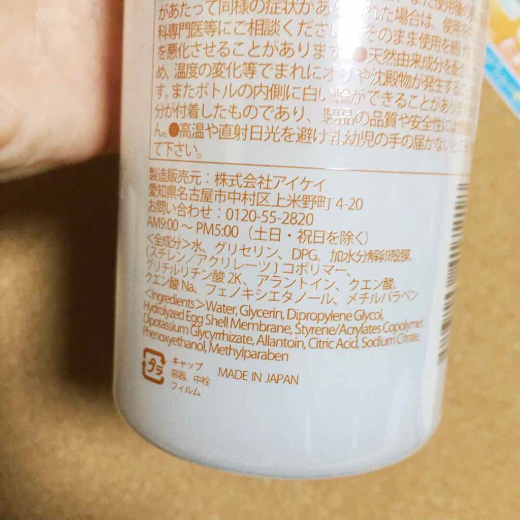 - 2023年4月3日リニューアル発売 「たまご化粧水」は卵由来の天然成分「加水分解卵角膜エキス」配合の化粧水です。 しっとりしているのにベタつかない感触でお肌になじみます。 顔や全身にも使える大容量タイプなのでお風呂上りにたっぷりお使いいただけます。 コットンなどにたっぷり含ませて5分ほどパックするとさらに効果的です。 無香料、無着色、低刺激性、オイルフリー、界面活性剤フリーです。